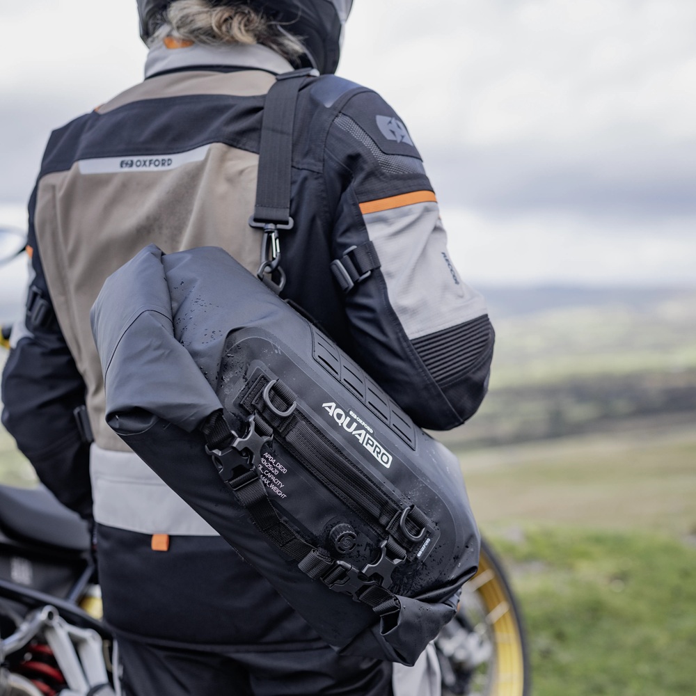 The Oxford Aqua Pro DE20 motorcycle roll bag has been designed without compromise for the most demanding adventure travel. Completely waterproof and wipeable, it sits easily atop your current motorbike tail bag for added storage.