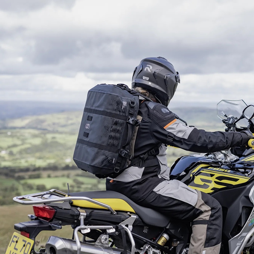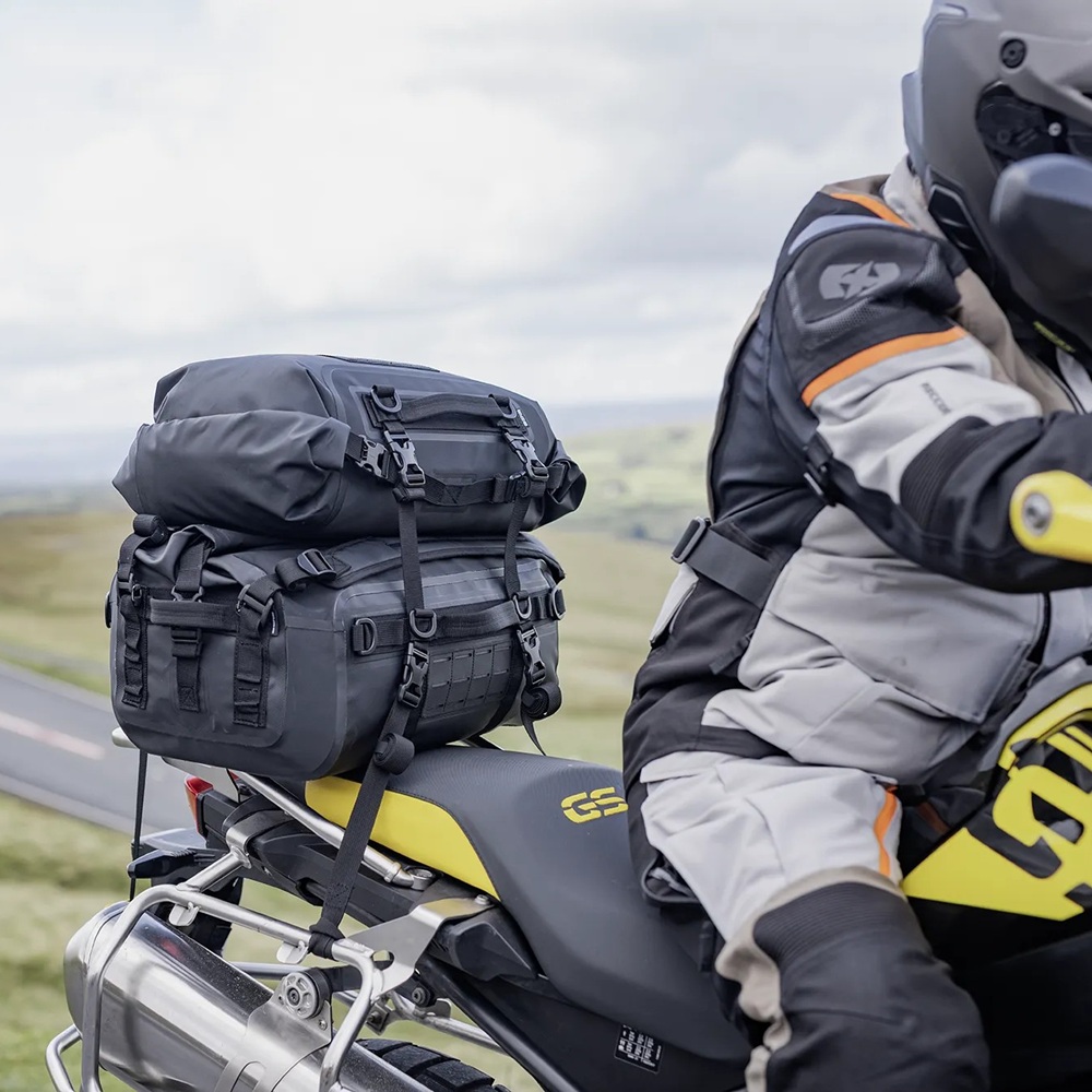 Completely waterproof and wipeable, a heavy duty 1000D PVC tarpaulin base is welded to a more supple 500D PVC roll top closure. Inside, you’ll find that a removable & semi-rigid EVA base gives the bag a solid form. Grab handles on all sides as well as detachable back-pack padded shoulder straps enable easy handling on and off the bike. Four quick-release buckle straps attach the bag securely to a motorcycle tail and an under-seat strap adds additional security.