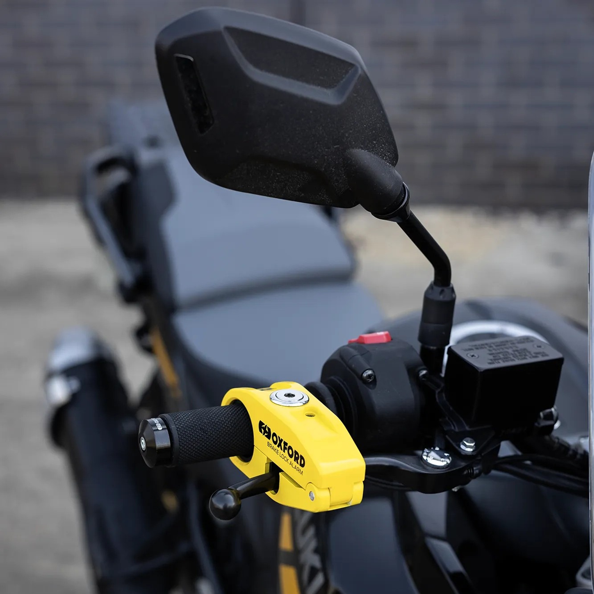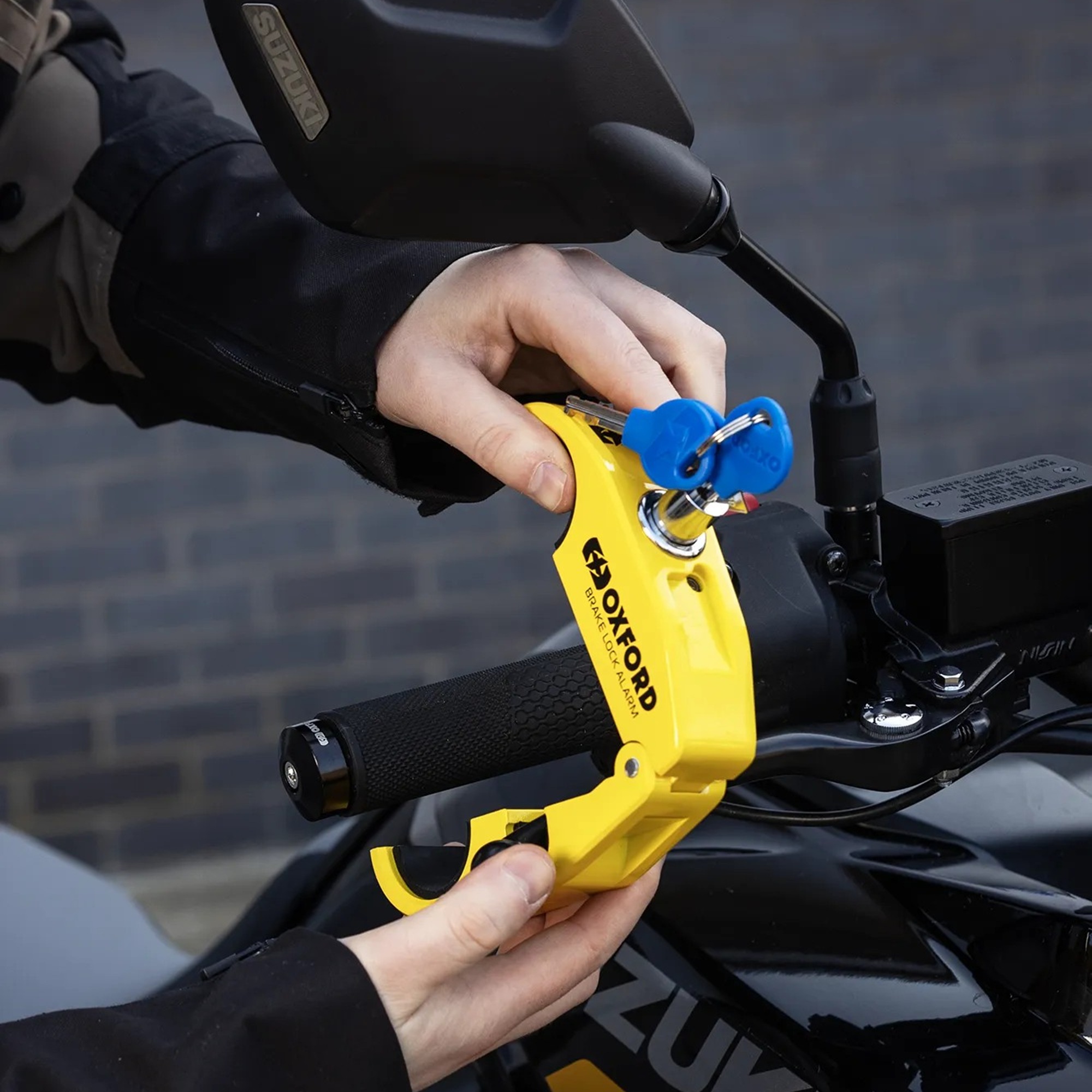 The Oxford Brake Lock Alarm features a durable cast-alloy body that securely locks your front brake using a stainless-steel key barrel. A 120dB alarm triggered by triaxial shock and movement sensors, adds an extra layer of protection. With an IP67 waterproof rating, the alarm offers peace of mind – even when your bike is left out in the rain.