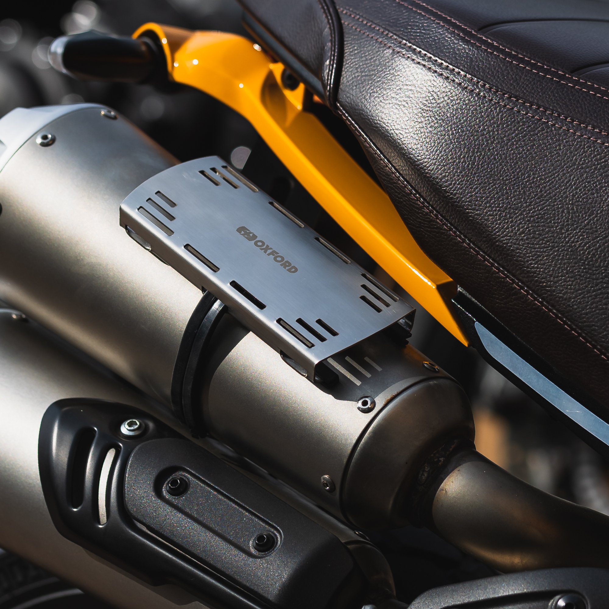The Oxford motorcycle exhaust heat shield offers thermal protection by deflecting radiated exhaust heat and guards against yourself, your clothing or your accessories from accidentally touching a hot exhaust system.