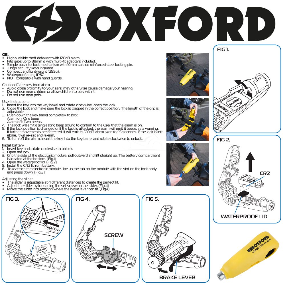 The Oxford Leverlock Alarm yellow is a highly portable motorcycle handlebar lock which is a great deterrent against would be thieves. A universal fit (28 mm – 38 mm) with a very simply push to lock function for riders looking to have a quick and easy way to secure their bike.