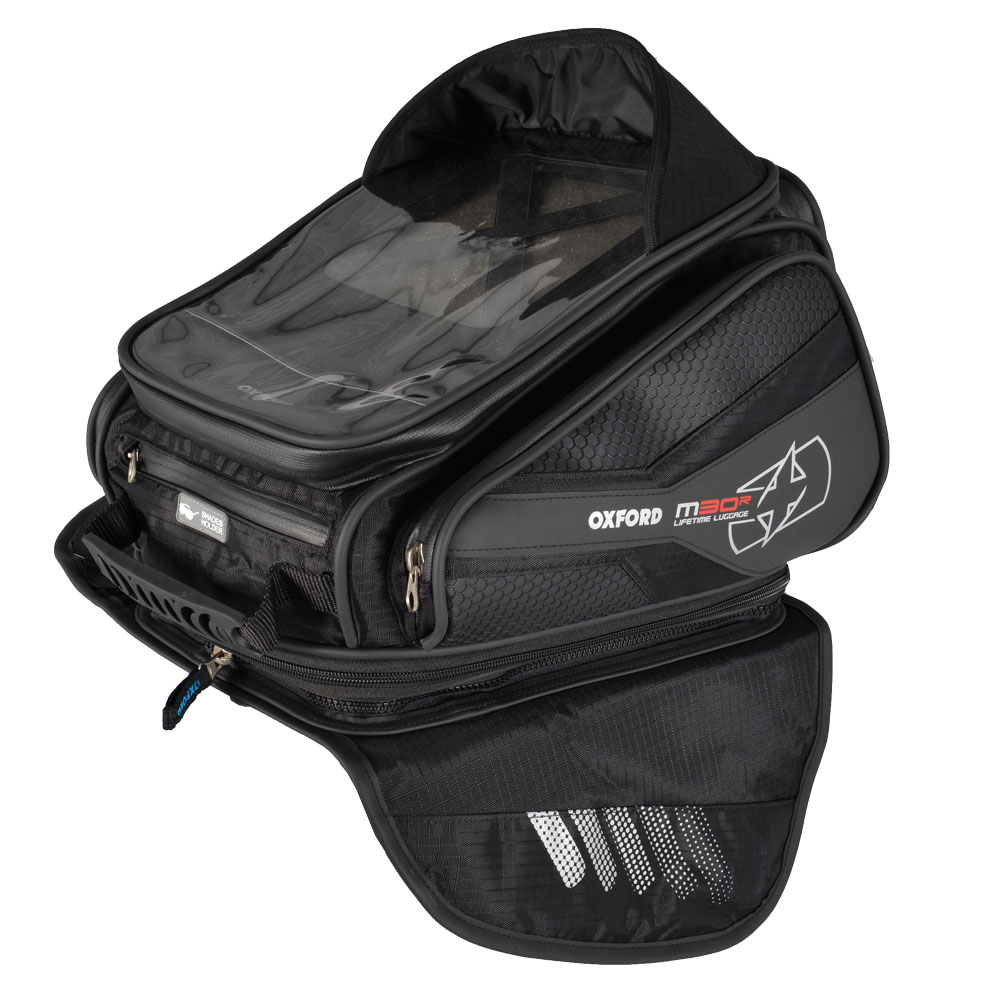 Sculpted and fit for purpose, the Oxford M30R black motorcycle tank bag is a must have for modern sports bikes and riders. Large enough to carry a full face helmet when expanded, it is equally capable of swallowing up enough gear for a weekend away.