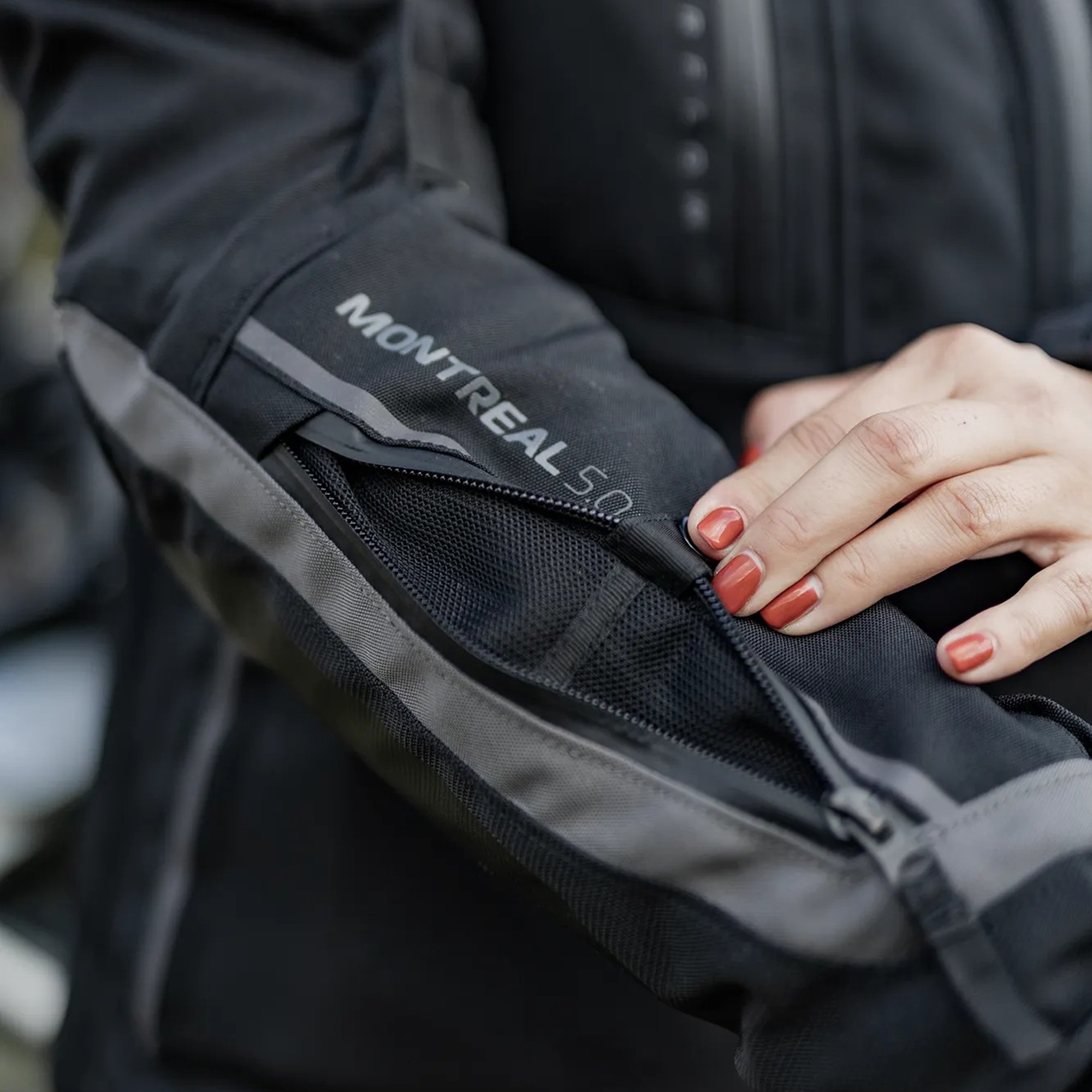 The Oxford Montreal 5.0 women’s motorcycle jacket pairs an upgraded HDR Poly™ (High-Density Recycled Polyester) outer shell with a high performing Dry2Dry® waterproof membrane for downpour-beating performance. The membrane also offers exceptional breathability (rated at 20,000g/m2/24hrs) ensuring a sweat-free, extended comfort ride, suitable for a wide range of conditions. Large, vented chest panels can be zipped open and folded inwards to create a flow of fresh air throughout the jacket, whilst SnapLock Vents™ at the forearms and chest draw maximum airflow. The removable thermal liner adds extra warmth on cooler days.