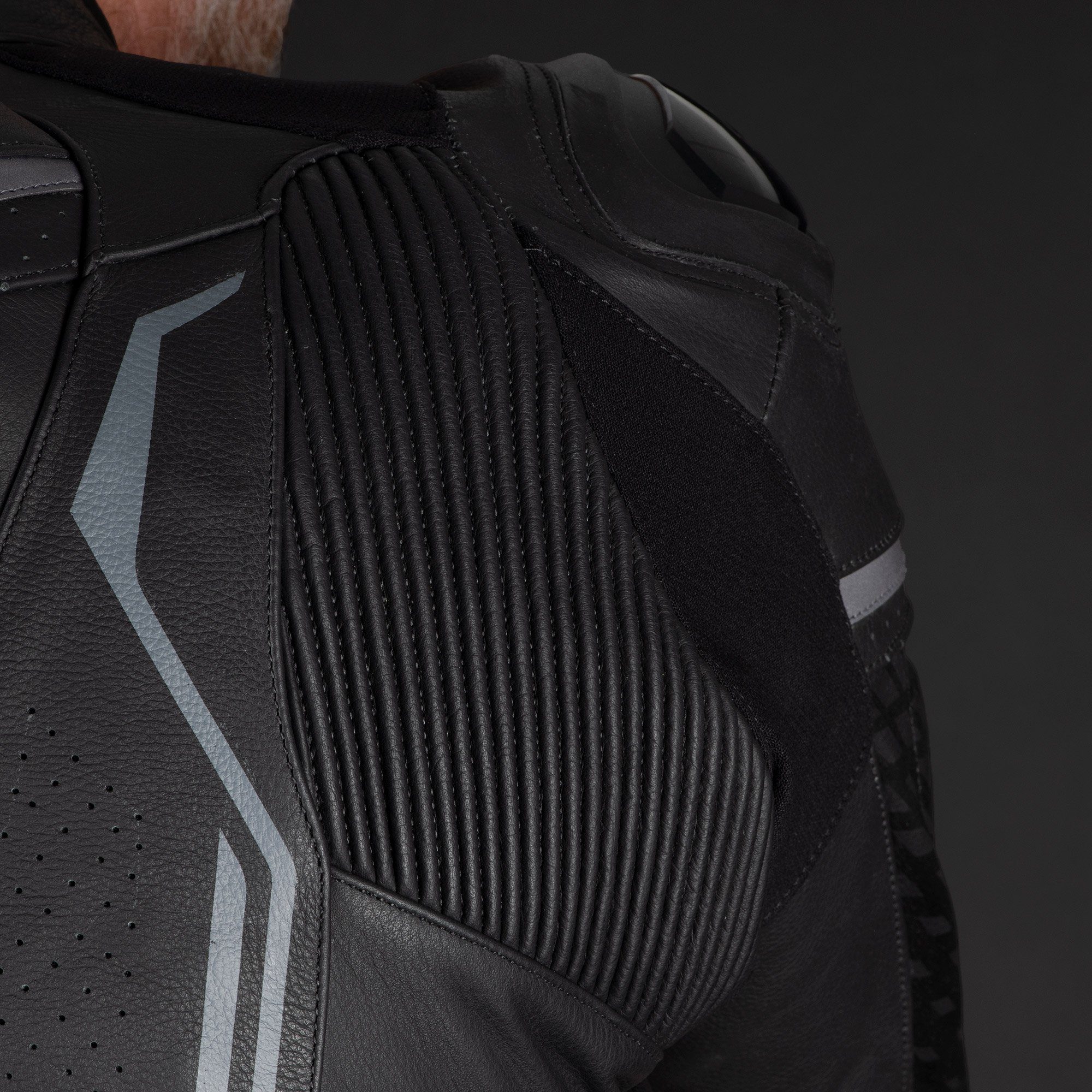 Accordion leather stretch panels at the upper back and above the elbow offer improved flexibility.