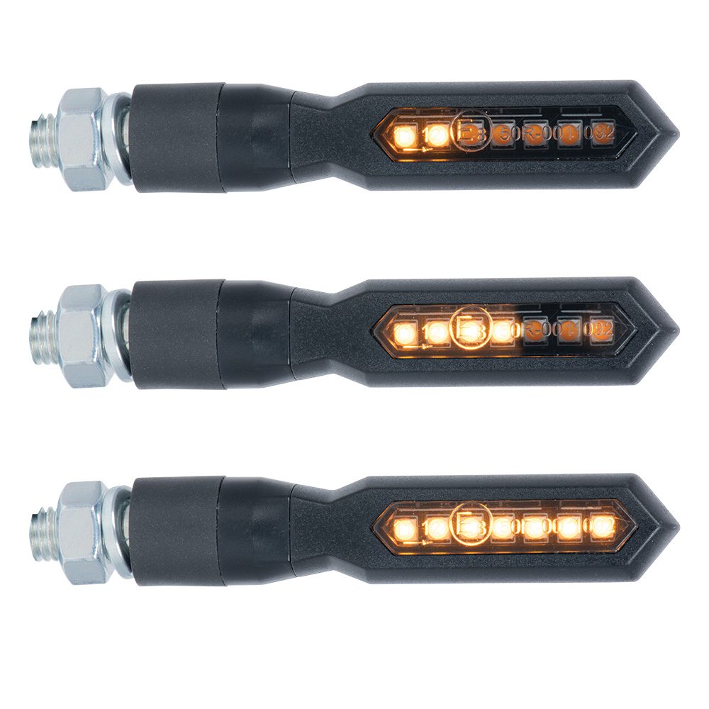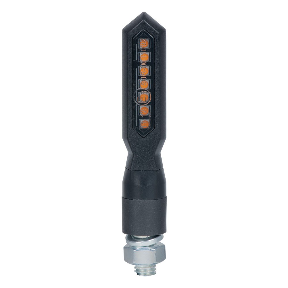 Replace and upgrade your old and tired motorbike indicators with the superb Oxford Nightstrider Sequential LED Indicators. A premium motorcycle indicator which contains 7 extra bright LED bulbs, which dynamically sweeps across from the inside to the outside of the indicator strip when activated.
