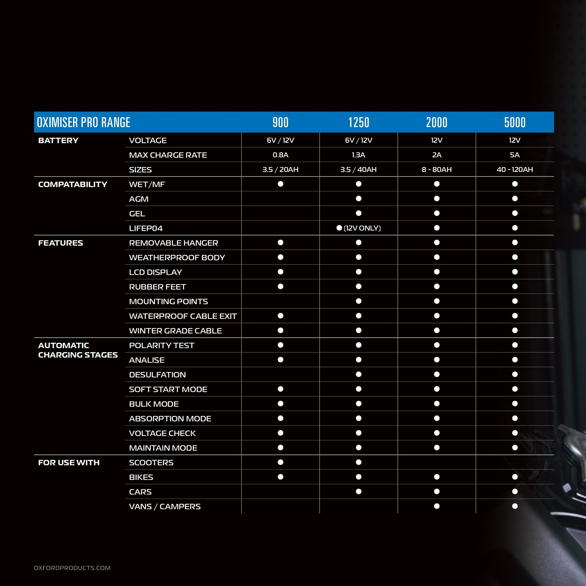 The Oximiser Pro 1250 charges a range of 6 and 12V batteries at a maximum charge rate of 1300mA (1.3Amps). The intelligent 8-stage automatic program ensures that every battery is correctly and safely charged to its optimum voltage before switching into maintain mode. Therefore extending the life of your motorcycle battery.