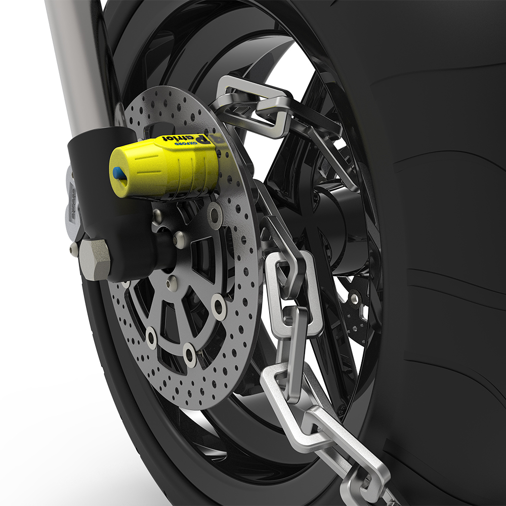 The Oxford Patriot motorcycle chain & lock is a superb solution for riders looking to keep their pride and joy safe, secure and under lock down at all times. Equipped with a heavy duty 12mm square link chain which has a protective sleeve to help protect your paintwork as well as show potential thieves you take motorcycle security seriously. The padlock features the advanced quarto locking system and doubles as a disc lock which will fit most bikes.