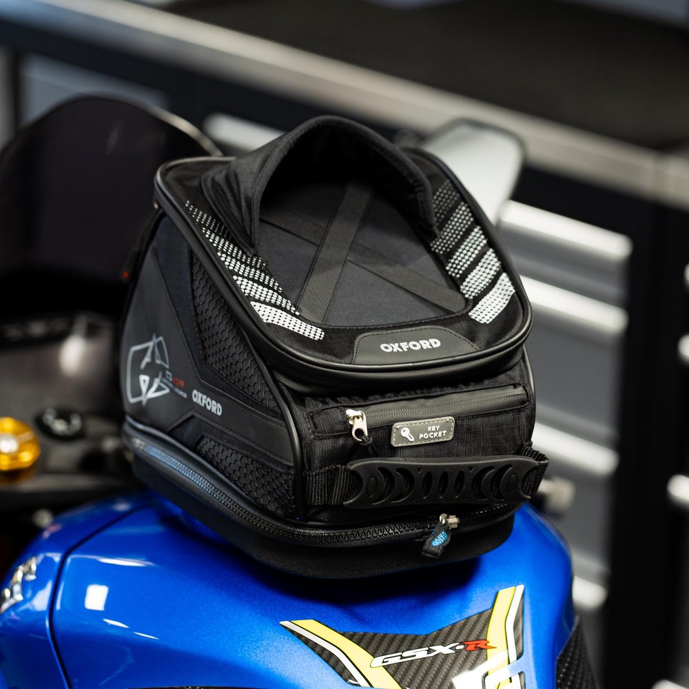 The Oxford Q4R black motorcycle tank bag is compact enough to be used on any bike, yet large enough to accommodate the essentials for a day’s riding. This could include a spare visor, and you wallet/purse & keys which help you ride in comfort.