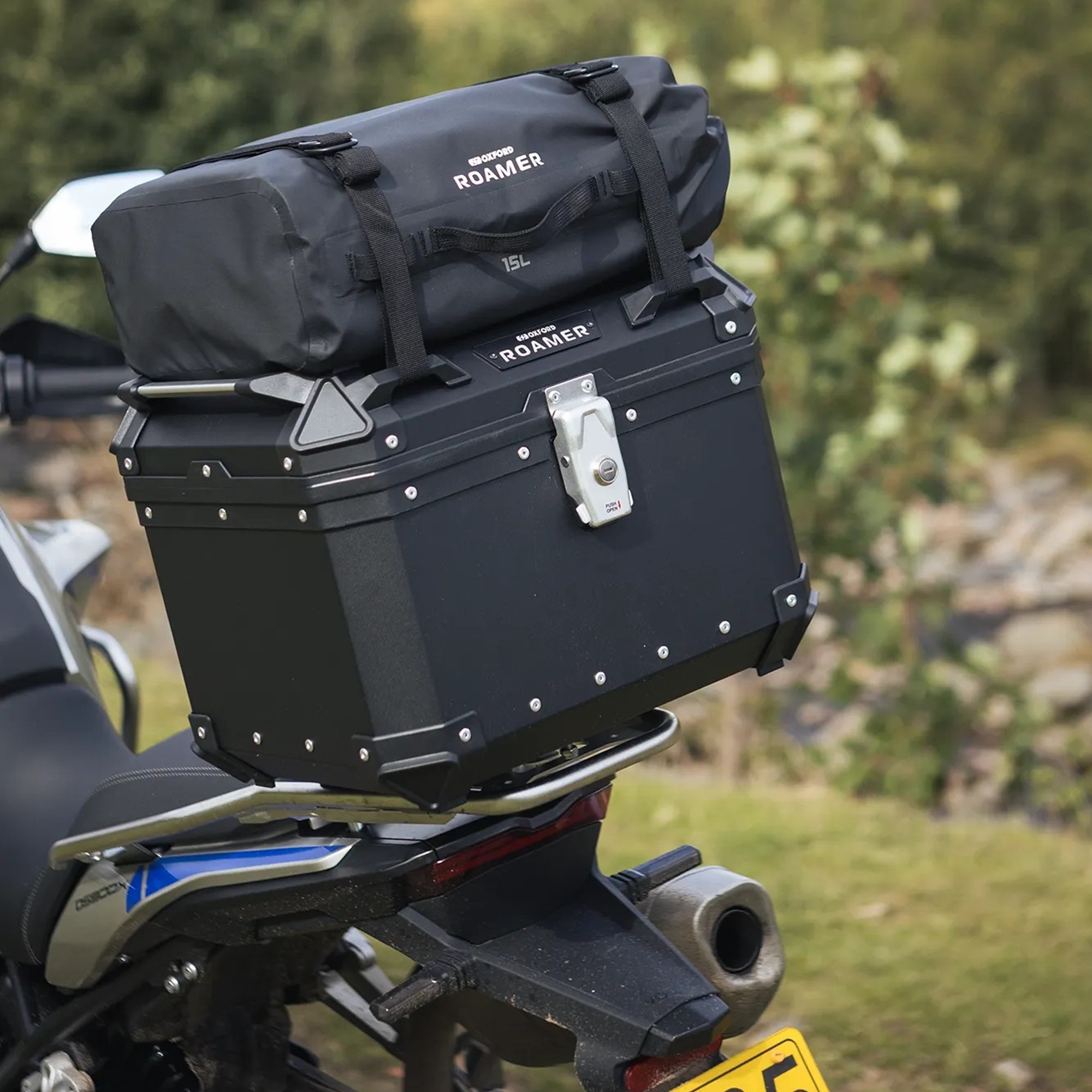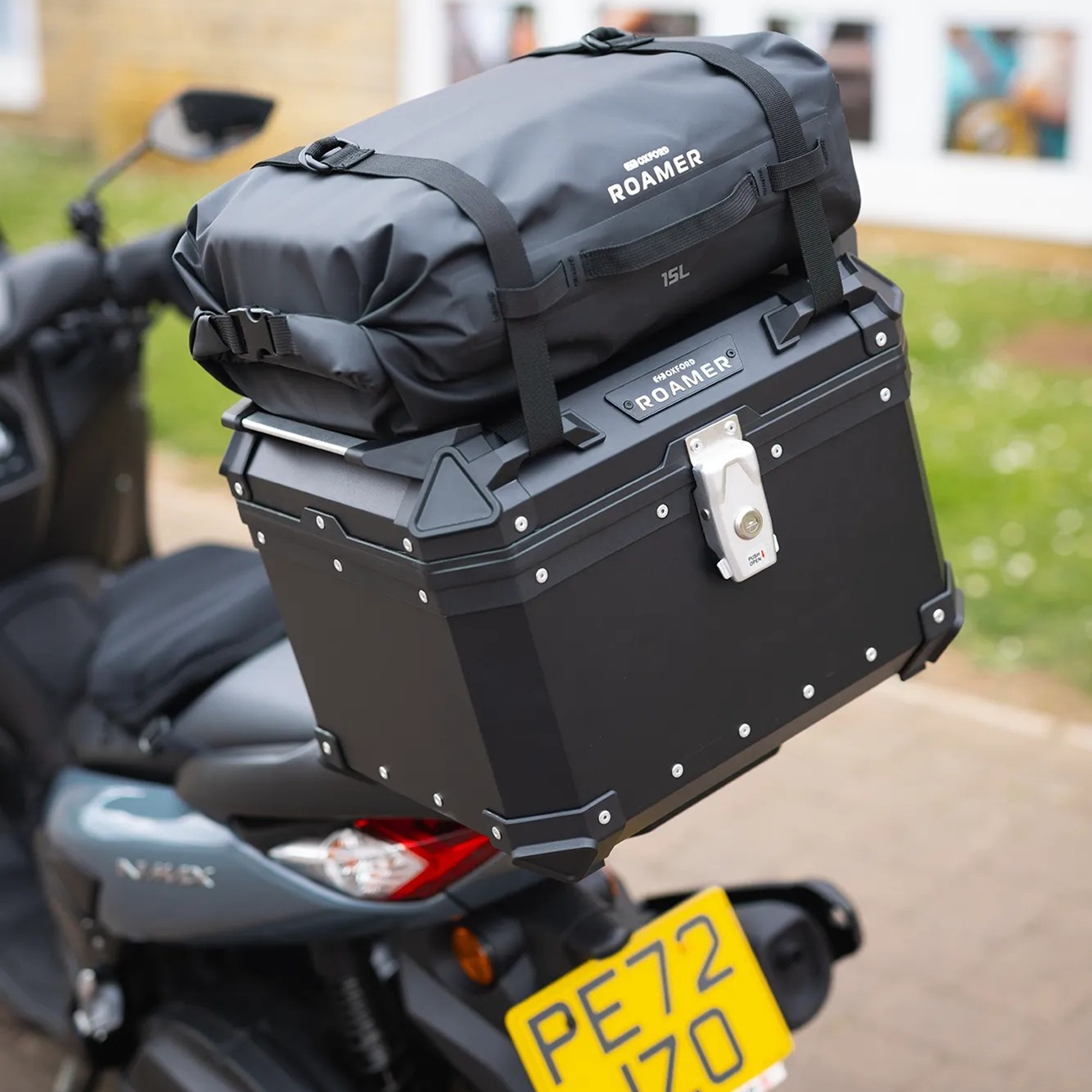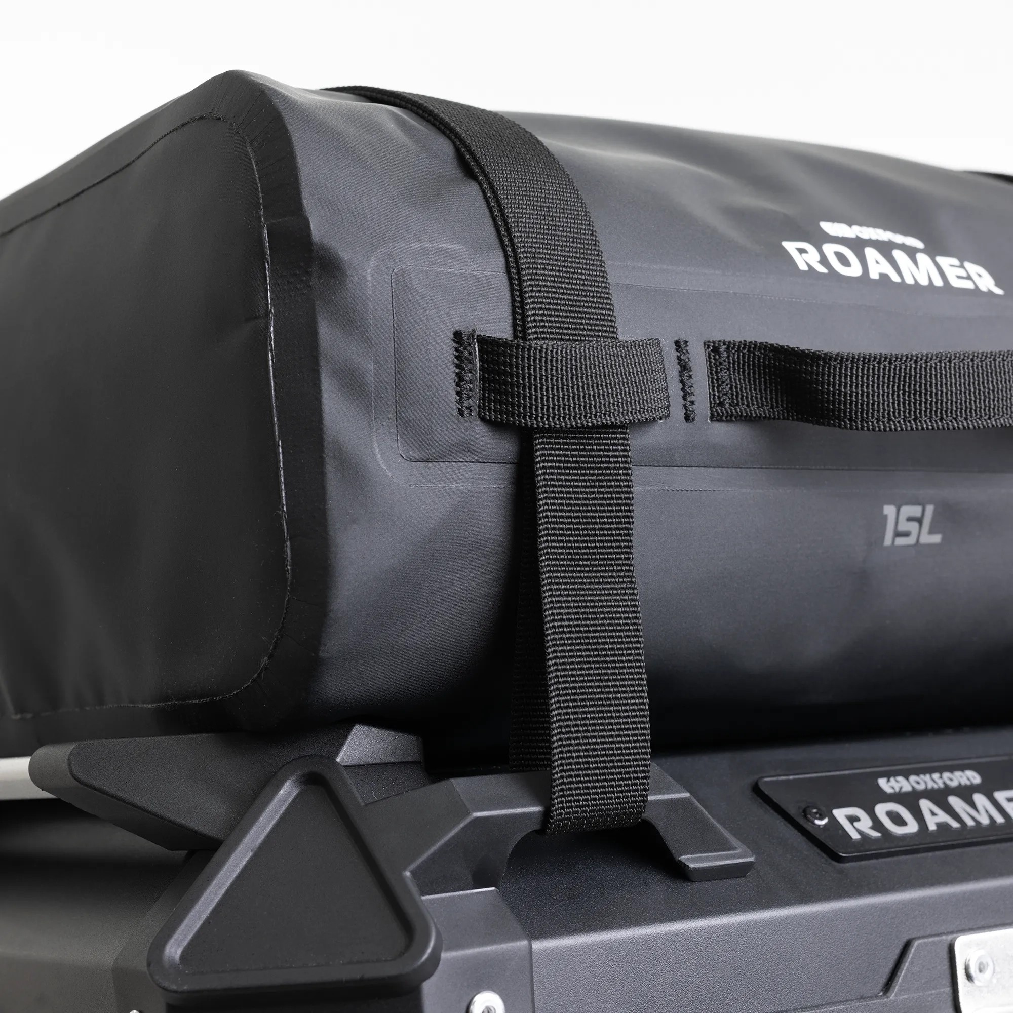 The Oxford Roamer 15L Motorcycle Roll Bag is made from 100% waterproof, tough, wipeable 500D PVC. With a generous roll top opening it’s easy to find items inside and it’ll hold enough kit for a day trip. Designed to attach onto the Roamer 45l Top Box via two straps secured by D-lock buckles, it is quick and easy to fit and has two grab handles for carrying when off the bike.