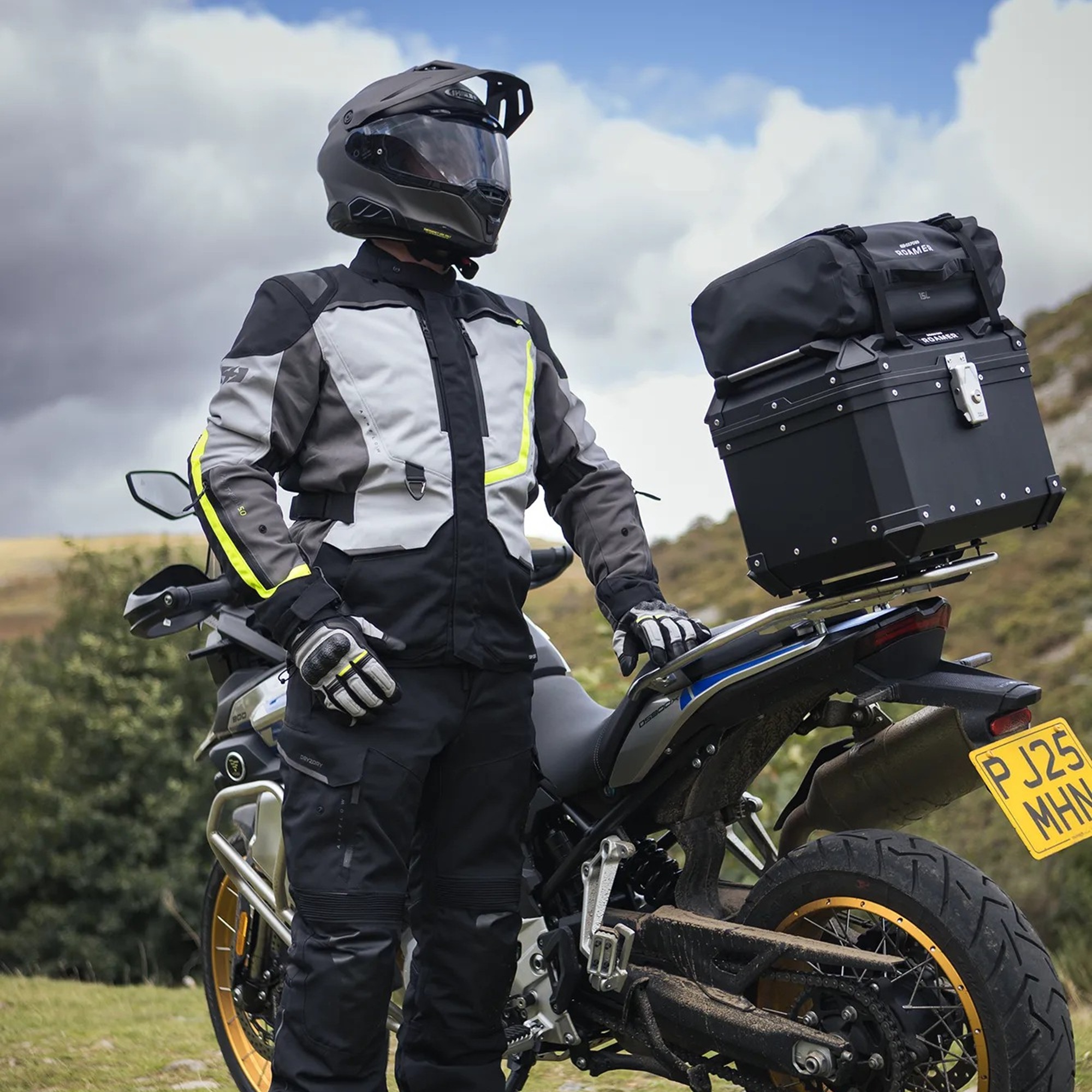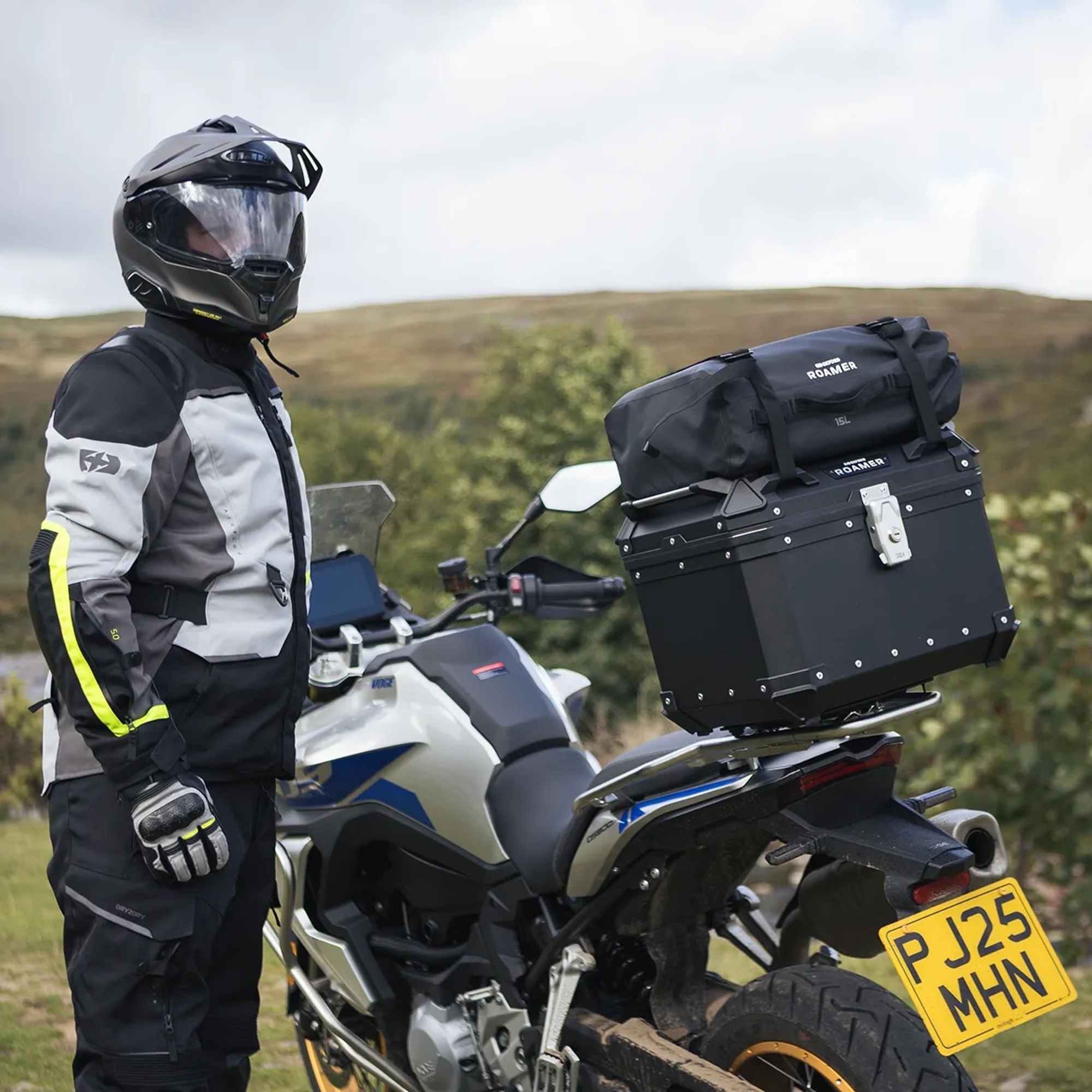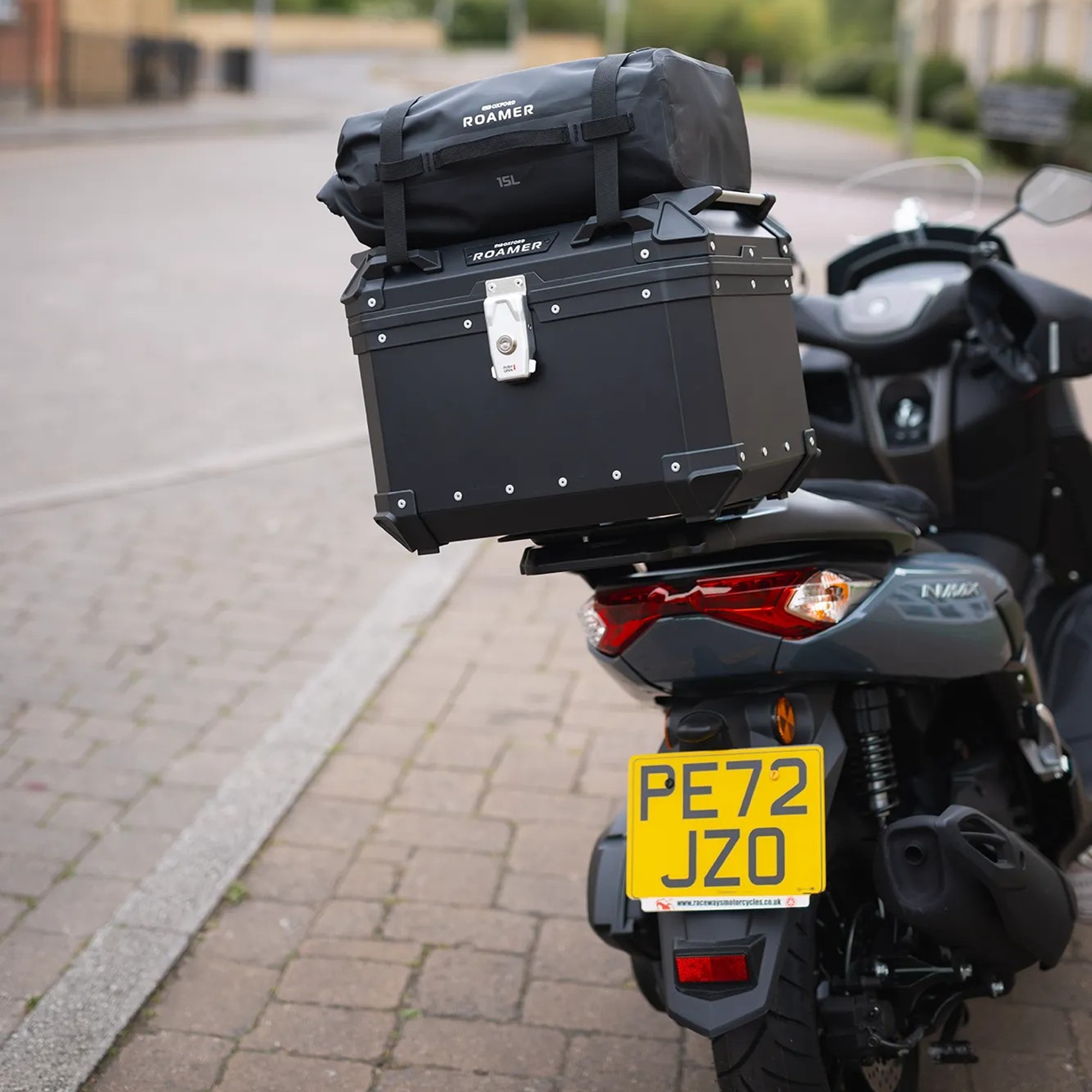 The Oxford Roamer 15L Motorcycle Roll Bag is made from 100% waterproof, tough, wipeable 500D PVC. With a generous roll top opening it’s easy to find items inside and it’ll hold enough kit for a day trip. Designed to attach onto the Roamer 45l Top Box via two straps secured by D-lock buckles, it is quick and easy to fit and has two grab handles for carrying when off the bike.