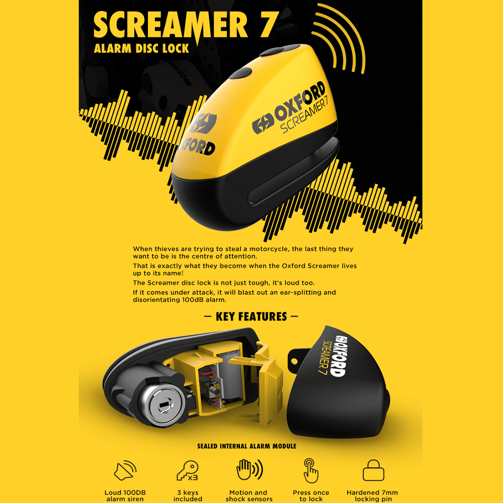 The Oxford Screamer motorcycle disc lock is perfect. When thieves attempt to steal a motorbike, the last thing they want to be is the centre of attention. This is where the Oxford Screamer 7 lives up to its name!
