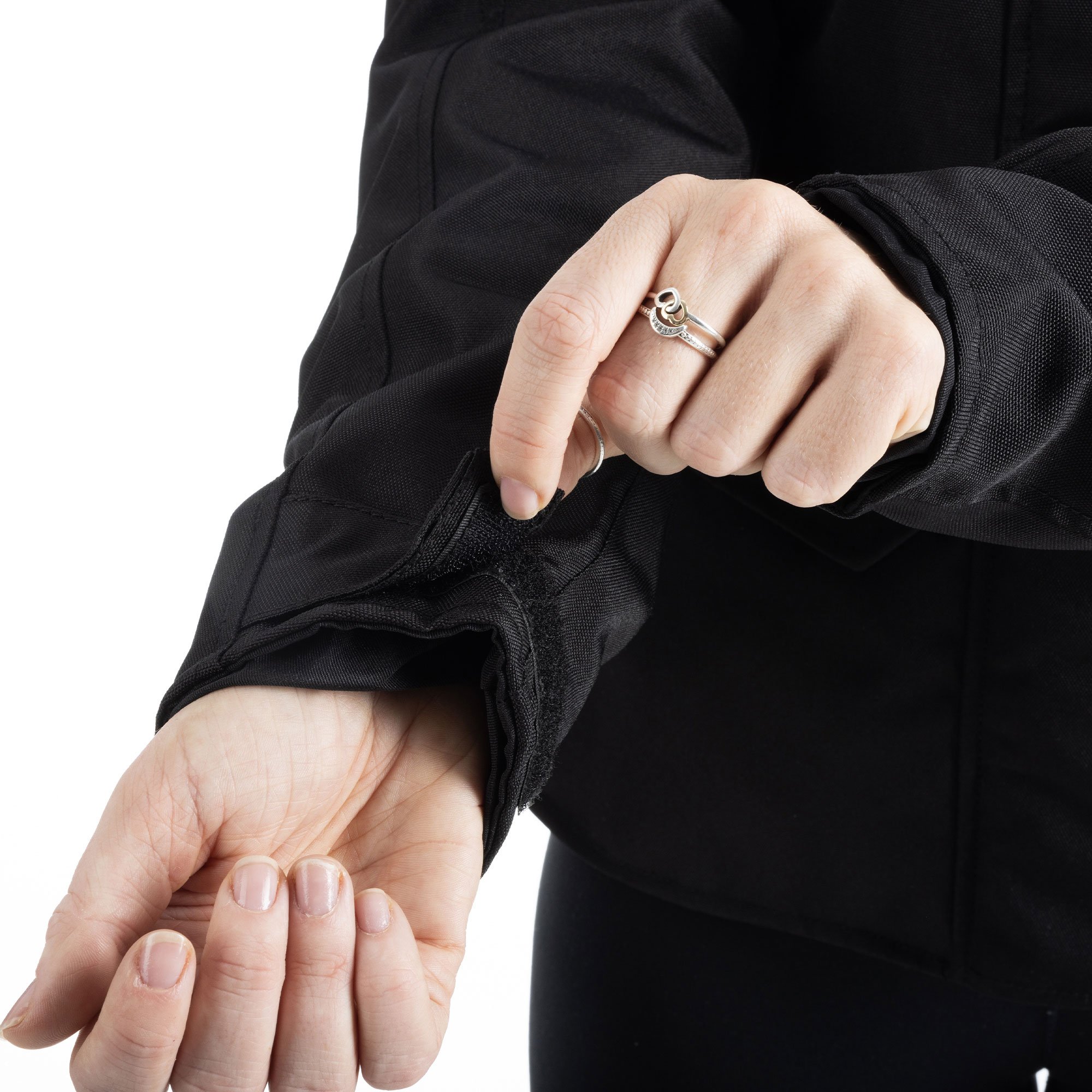 Hook and loop waist, cuff and collar adjustment.