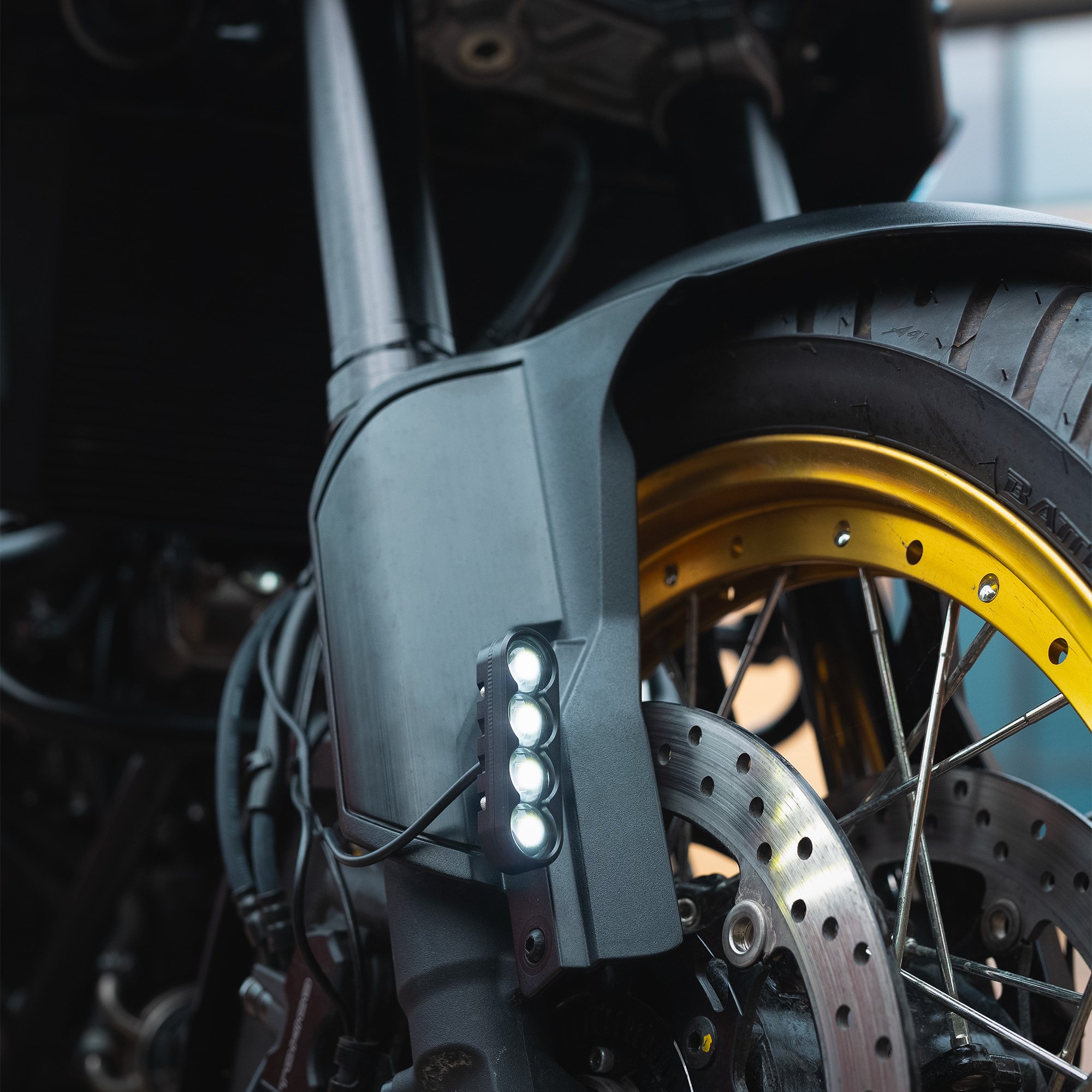 The Strip motorcycle light is designed to improve the visibility of the motorcycle to oncoming road users. The front lights can be effortlessly mounted in multiple positions on the front of your motorbike. Made from durable CNC anodised aluminium.