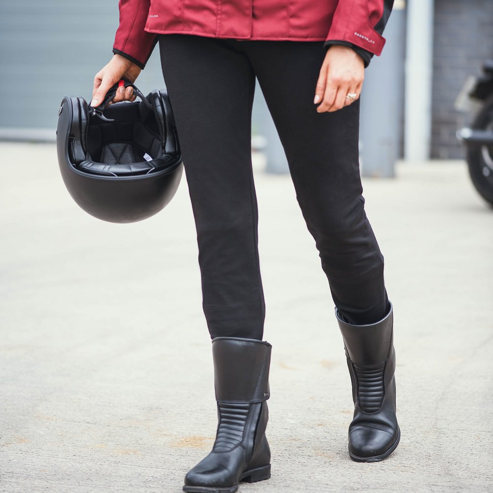 Reinforced rider’s leggings with CE protectors and aramid reinforcements.