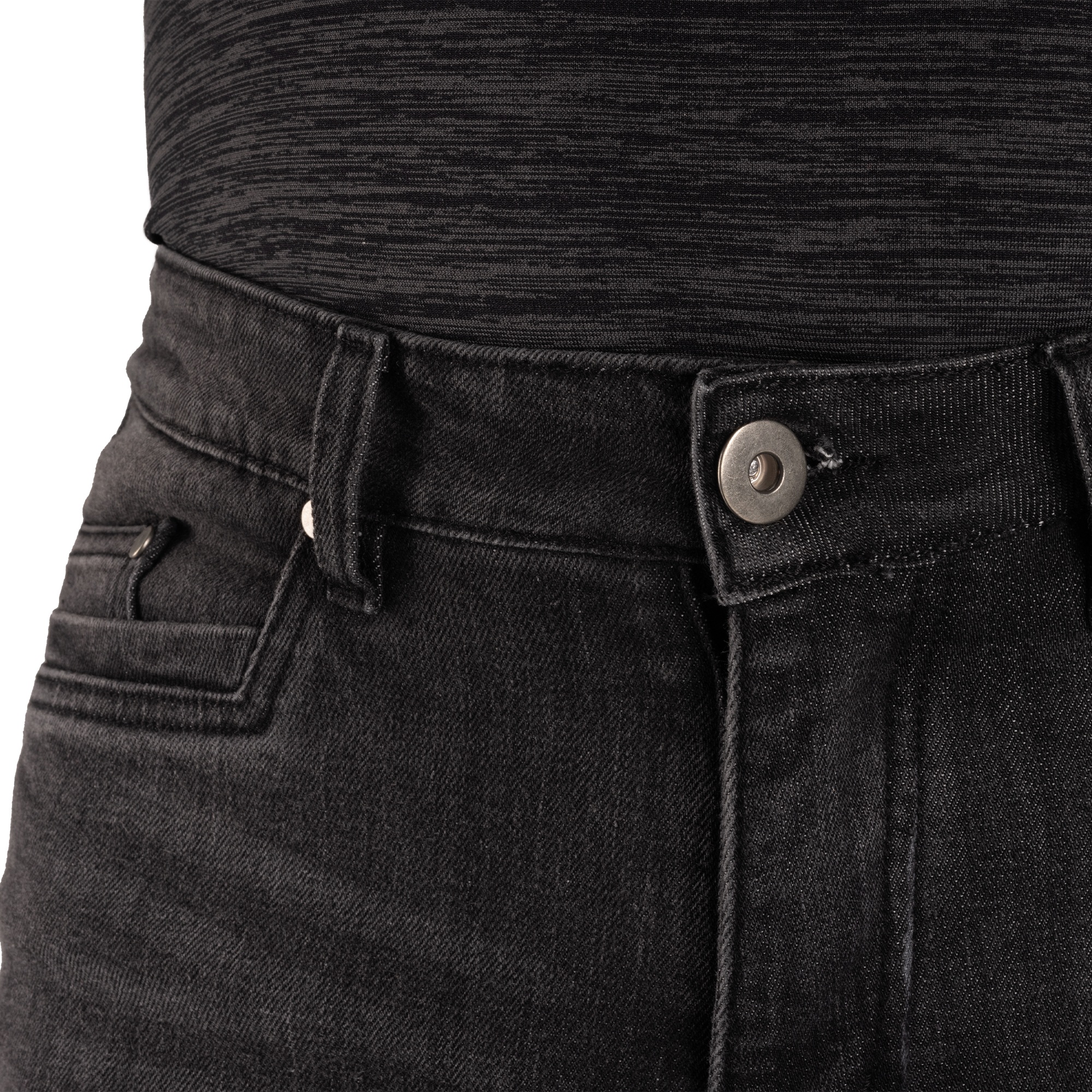 Inside the reinforced motorcycle jeans you’ll find a tough abrasion resistant aramid fibre lining which sits on a soft stretch mesh base, and part lines the jeans on the seat, hips, thighs, knees and shins. This lining securely holds armour pockets, which have internal access for easy removal of CE approved knee and hip protectors. This effortlessly helps conceal them from sight without compromising the styling of the jeans.