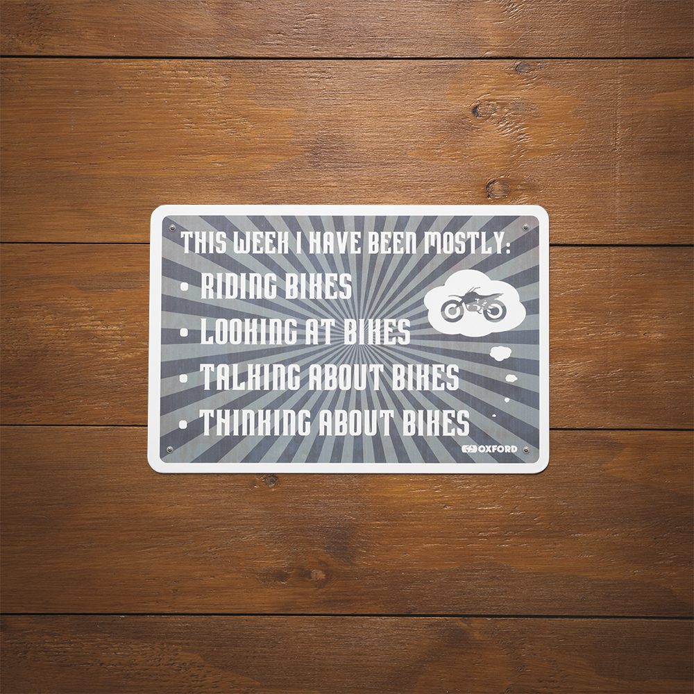 The Oxford This Week motorcycle garage sign is perfect for riders looking to finish of their workspace, sheds and garages. Celebrate being a part of the greatest community on earth by displaying a metal motorcycle sign on your wall. Whether you commute to work, cross continents or tear up the race track there’s a sign that suits your riding style. With pre-drilled holes perfect for mounting, the metal motorbike sign is a superb gift for the biker who has it all.