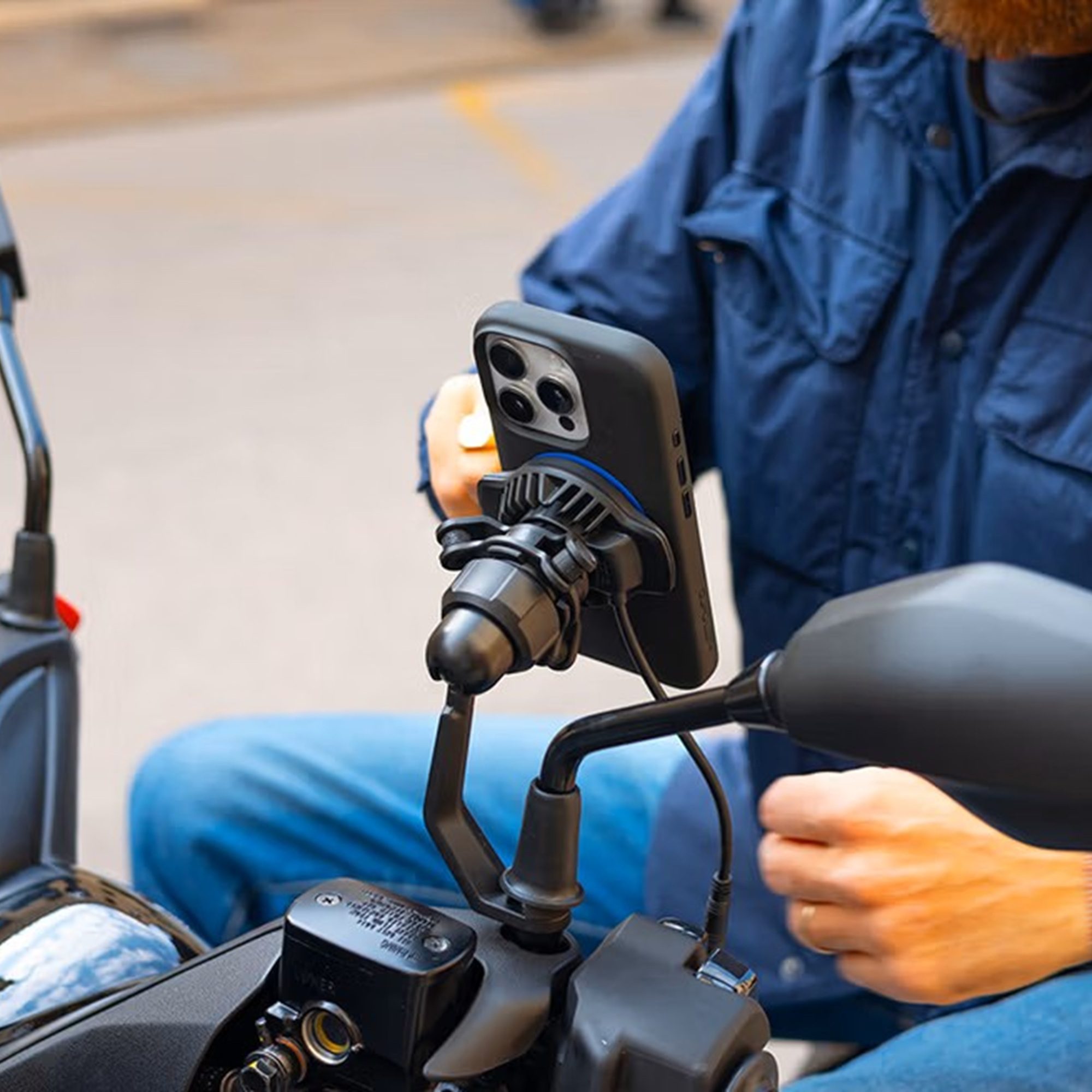 The offset, angled arm allows for clearance to components and trim in various installation setups on the left or right hand side of your scooter or motorcycle. Make finer adjustments to your phone’s viewing angle with the gimbal pivot head – no tools required.