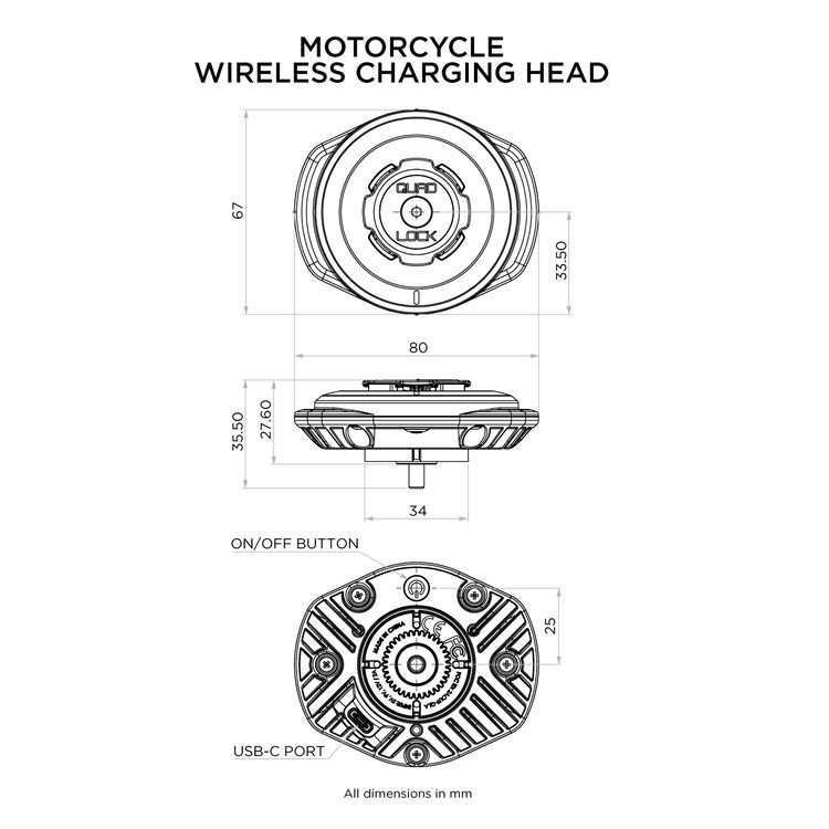 Quad Lock Waterproof Motorcycle Wireless Charging Head 12V-24V