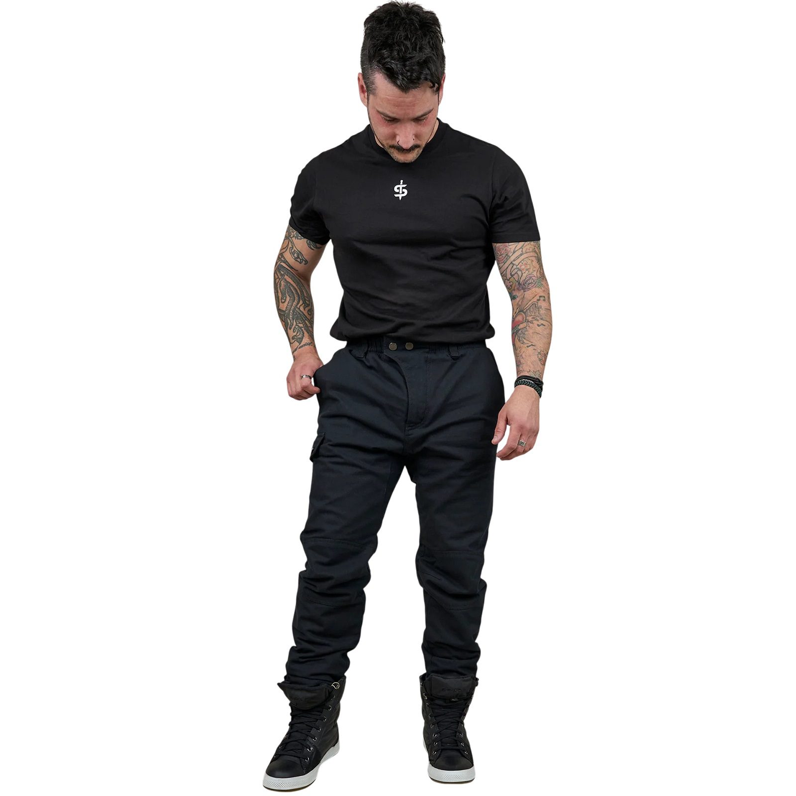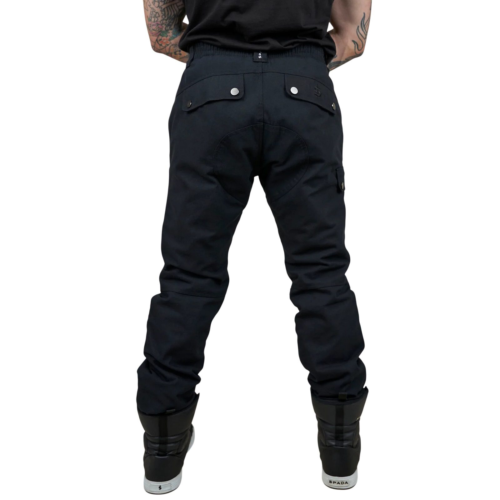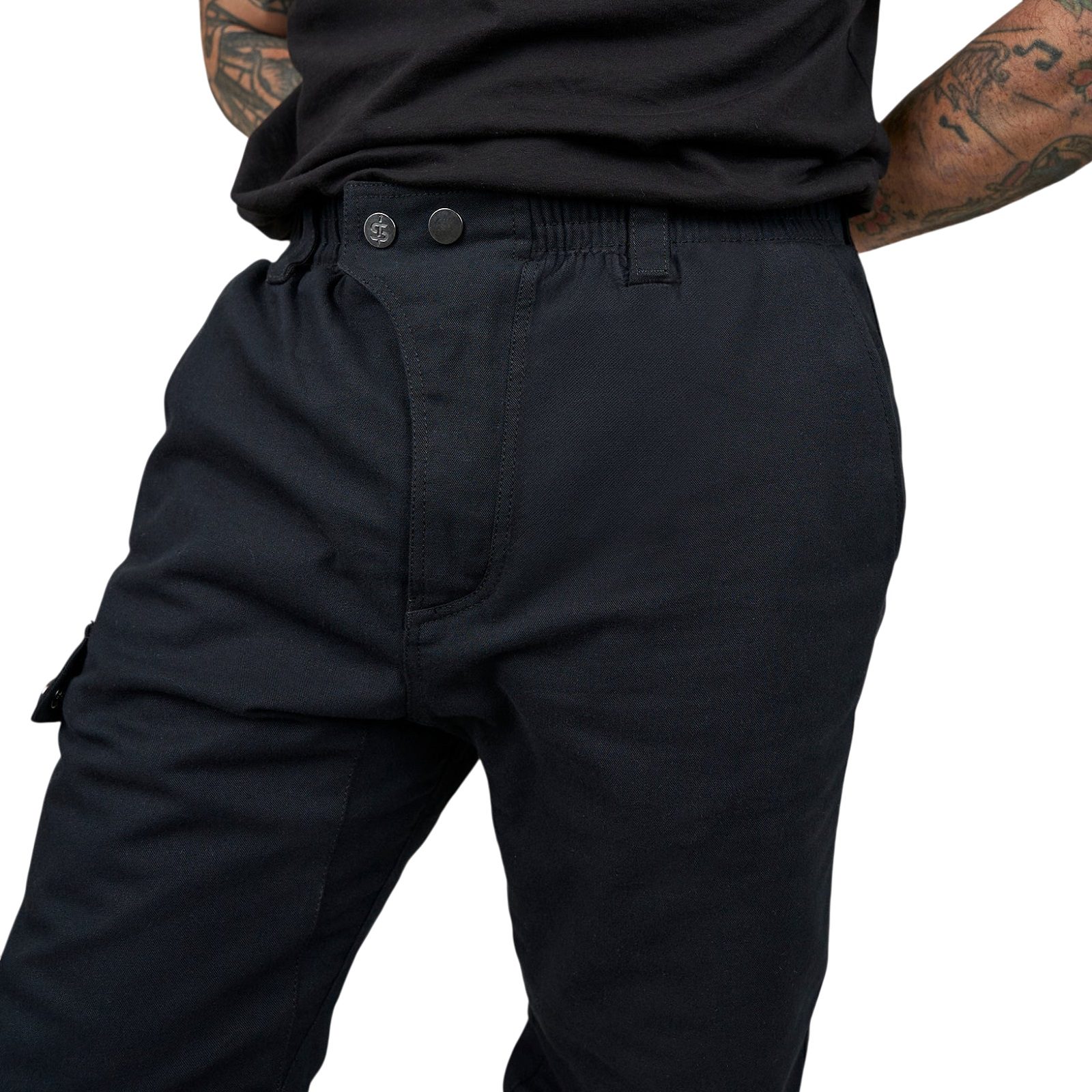 The Spada Pilot black motorcycle trousers offer a tough and durable canvas polycotton fabric construction, built to withstand the rigours of the road. Designed with ergonomic knees for improved comfort and mobility, they provide enhanced flexibility while riding. The concealed stud-fastened hip pockets offer secure storage for your essentials, while the abrasion-resistant mesh lining adds an extra layer of durability and protection. Perfect for riders seeking a balance of style, comfort, and strength on every ride.
