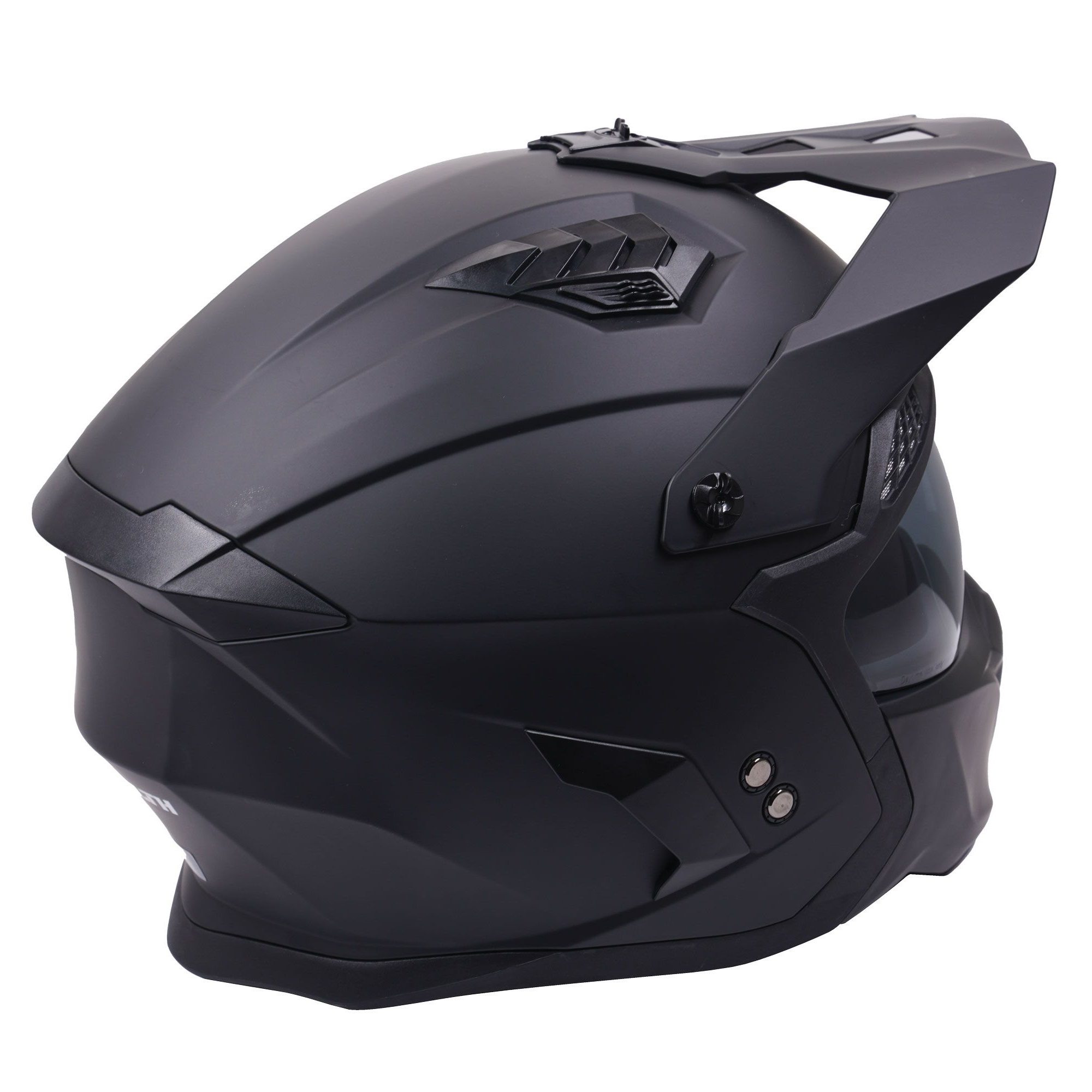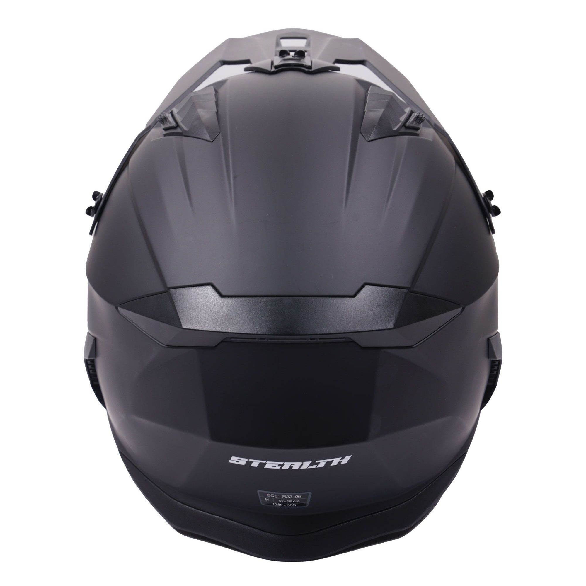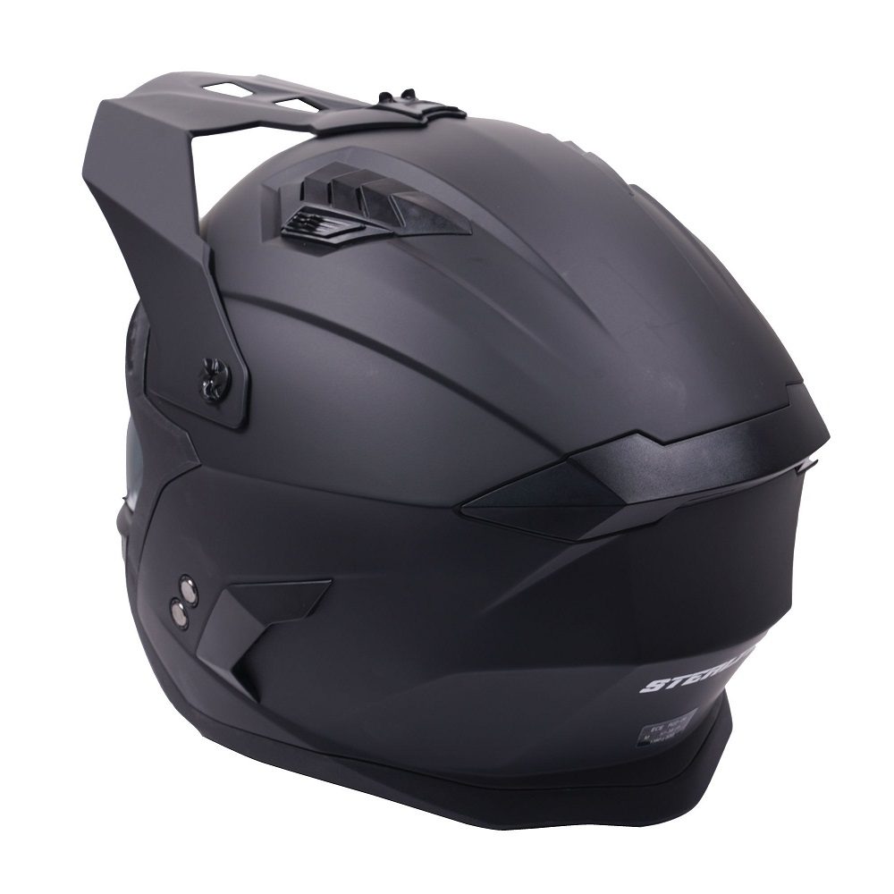 The Stealth Fighter Plain dual sport motorcycle helmet is a great choice for adventure, enduro and road riders looking for the best of both worlds. The convertible motorbike helmet has a removable chin bar, allowing you to tackle any off-road trials ride and then ride home without having to change helmet. The motorbike helmet comes with a drop down sun visor and the new and improved safety standard of ECE 22.06. Packed with features that help improve your riding experience. Available in a range of colours to match any riders gear, bike and personal taste!