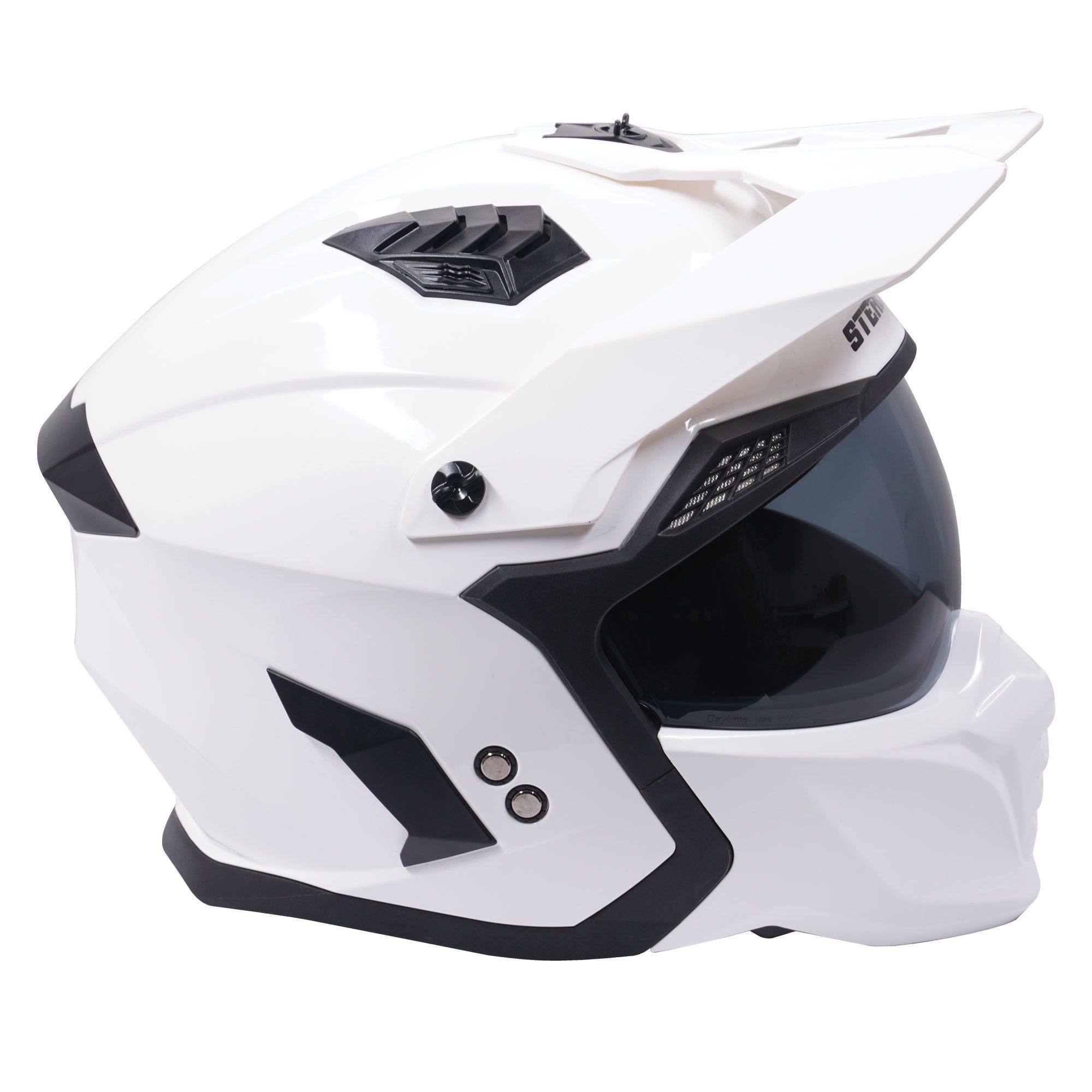 The Stealth Fighter Plain dual sport motorcycle helmet is a great choice for adventure, enduro and road riders looking for the best of both worlds. The convertible motorbike helmet has a removable chin bar, allowing you to tackle any off-road trials ride and then ride home without having to change helmet. The motorbike helmet comes with a drop down sun visor and the new and improved safety standard of ECE 22.06. Packed with features that help improve your riding experience. Available in a range of colours to match any riders gear, bike and personal taste!