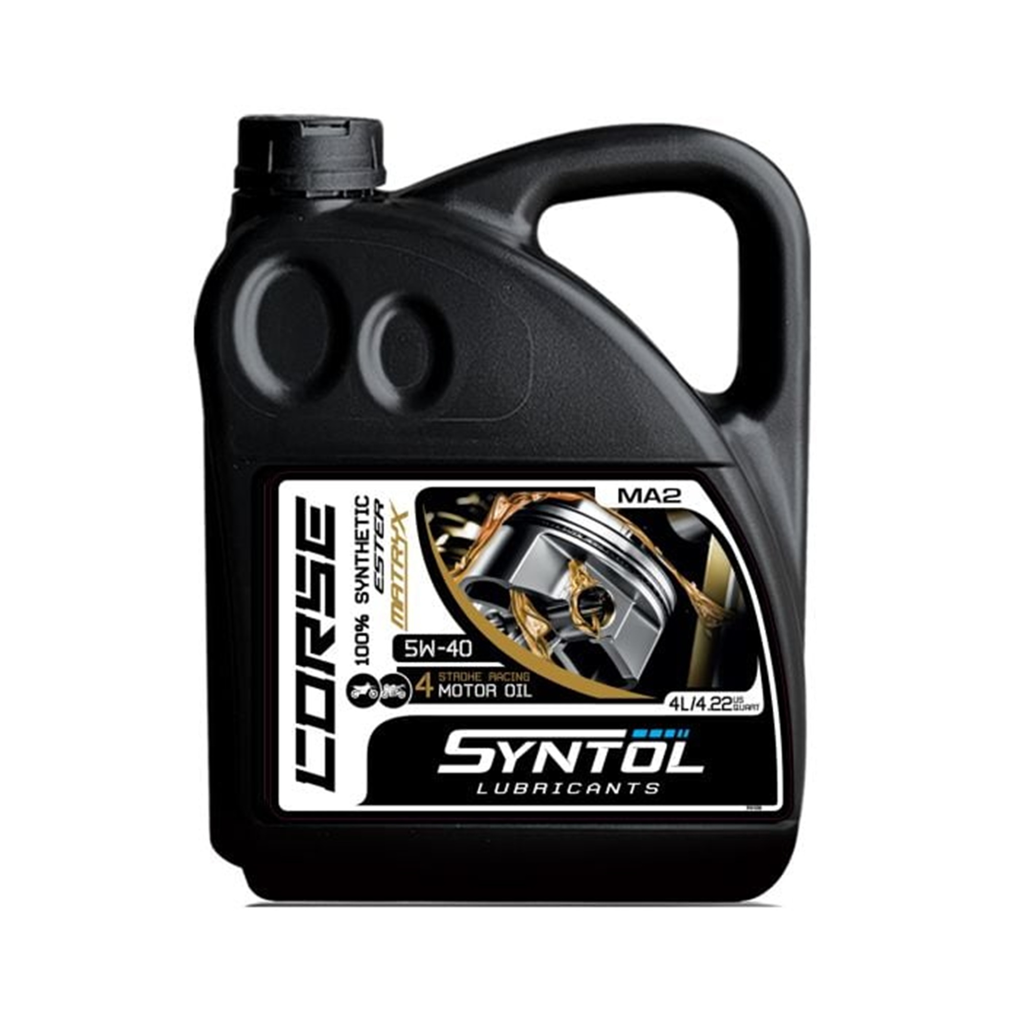 The Syntol Corse 4T 5W-40 Fully Synthetic motorcycle oil is a high performance synthetic ester 4 stroke motorbike oil developed to exceed the requirements of all bike manufacturers where viscosity grade is appropriate. The use of Syntol’s proprietary ester Matryx® technology, along with innovative additive chemistry guarantees performance without any compromise on component wear, engine reliability or catalytic converter compatibility.
