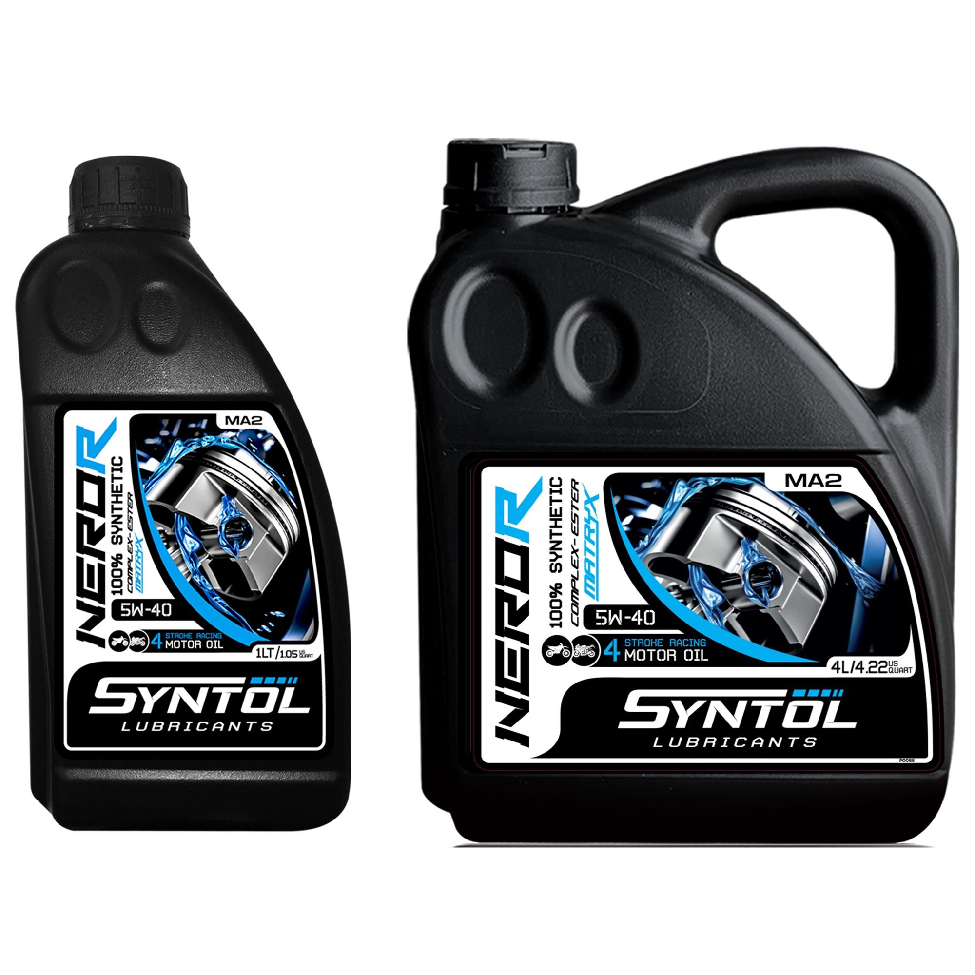 The Syntol Nero-R 4T 5W-40 racing motorcycle oil is an ultra high performance 100% synthetic Ester 4 stroke racing motorbike oil. Proprietary complex-Ester matryx® technology, along with innovative additive chemistry guarantees maximum engine power without any compromise on component wear or engine reliability.