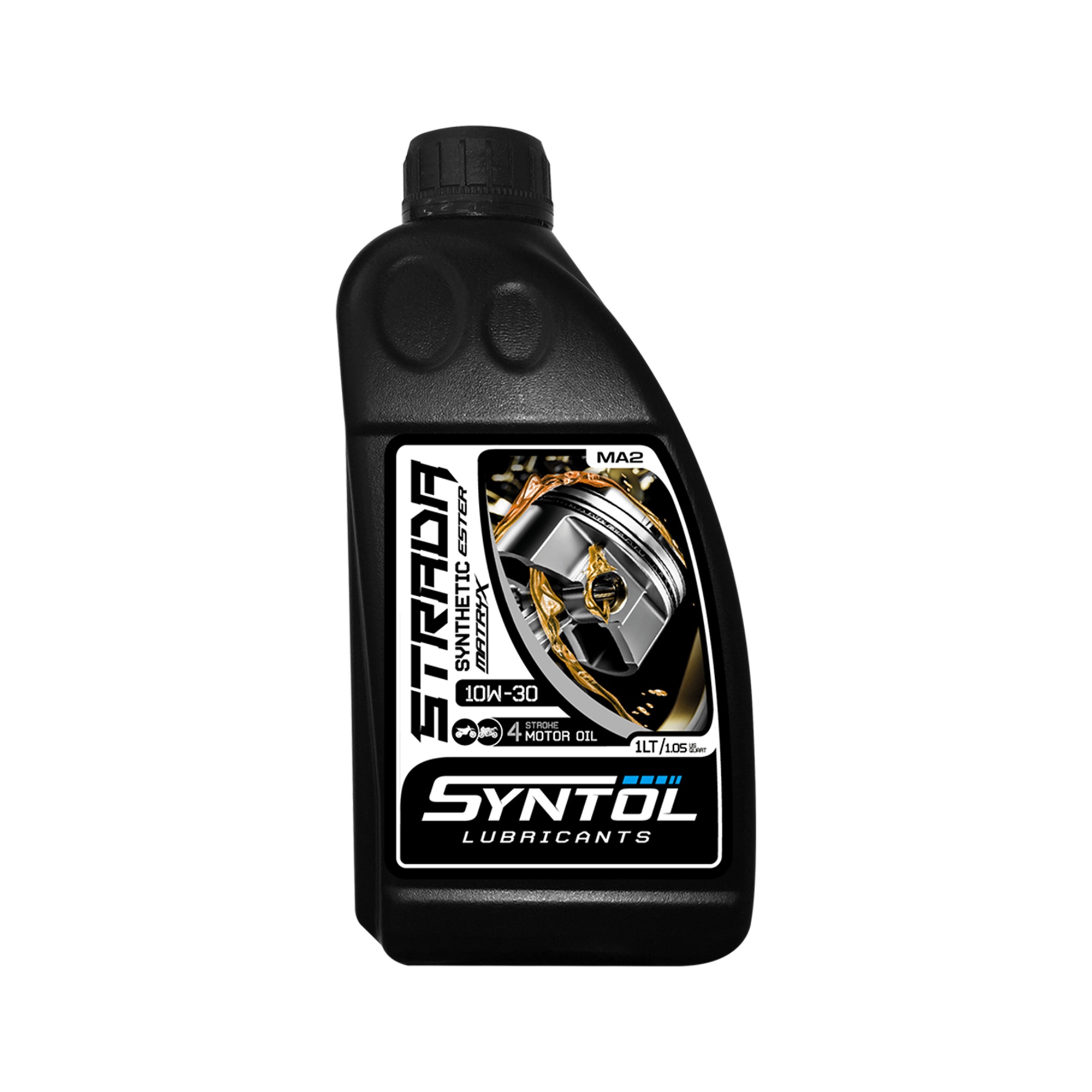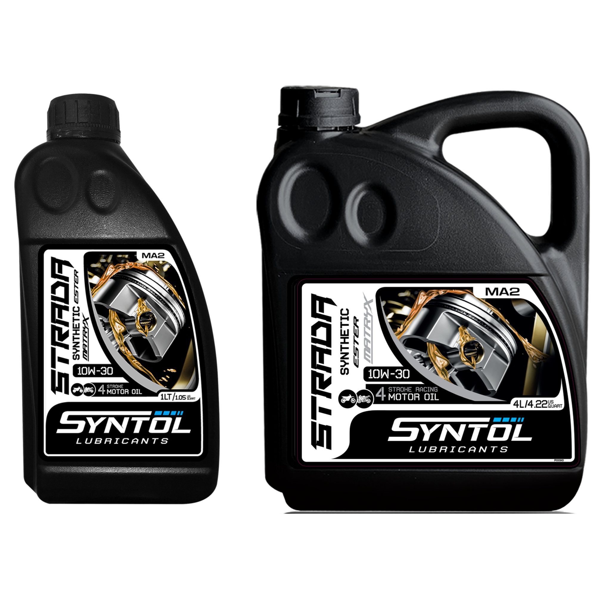 The Syntol Strada 4T 10W-30 Semi-Synthetic motorcycle oil is a high performance synthetic Ester 4 stroke motorbike oil. Proprietary Ester matryx® technology, along with innovative additive chemistry guarantees performance without any compromise on component wear, engine reliability or catalytic converter compatibility.