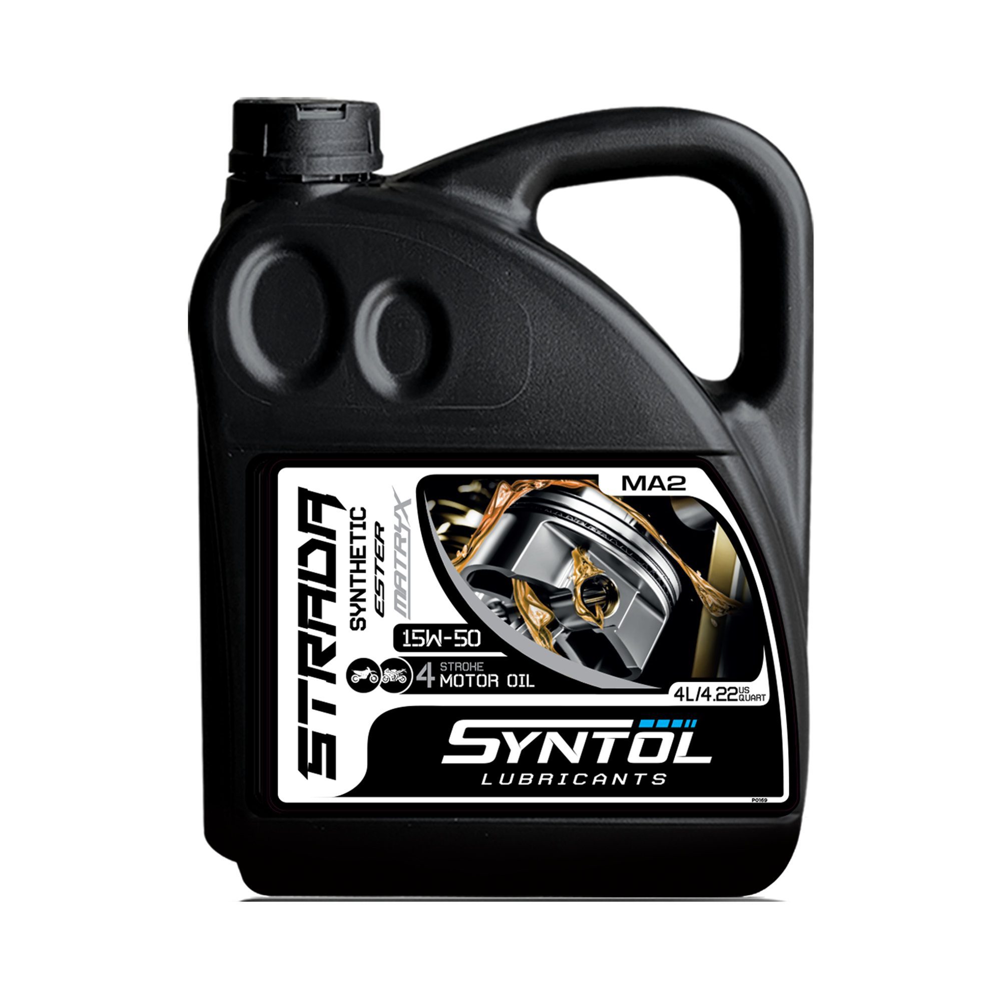 The Syntol Strada 4T 15W-50 Semi-Synthetic motorcycle oil is a high performance synthetic Ester 4 stroke motorbike oil. Proprietary Ester matryx® technology, along with innovative additive chemistry guarantees performance without any compromise on component wear, engine reliability or catalytic converter compatibility.