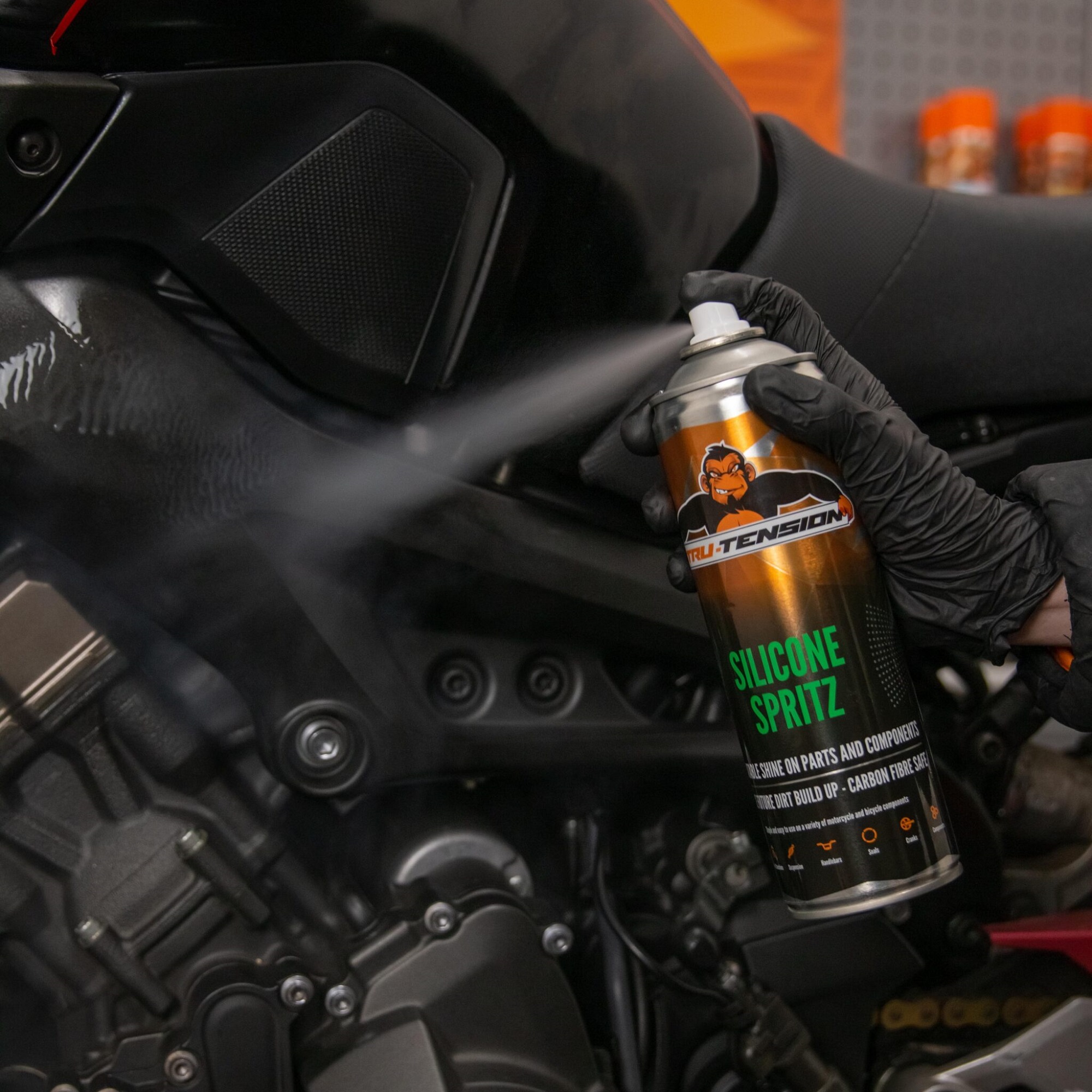 The Tru-Tension Silicone motorcycle Spray ideal for use on frames, fork stanchions, rear suspension, metal and plastic components, handlebars, seals and more! Leaving a slippery deep gloss shine which helps prevent new dirt from sticking. The perfect product for that final shine on parts and components while helping to prevent future dirt build-up.