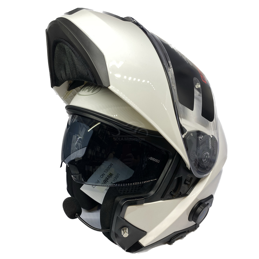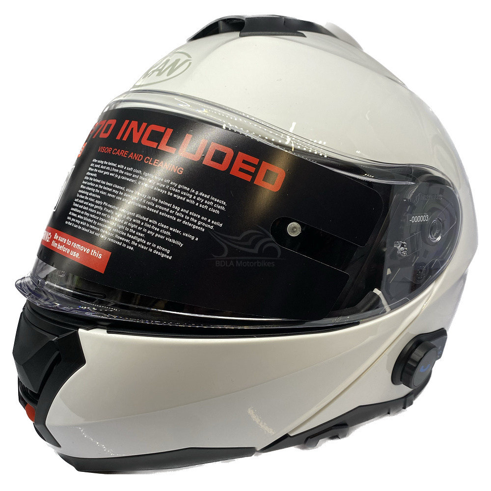 The Vcan H272 Blinc plain motorcycle helmet is a great choice for commuter and touring riders who want to stay in touch. Effortlessly connect your Blinc equipped motorbike helmet to your mobile phone to start handling incoming and outgoing calls as well as stream music. The flip up Bluetooth scooter helmet also connects to other Vcan Blinc A4 helmets using the built-in intercom, with a range of up to 650 metres. The system is completely integrated into the helmet and consists of a noise reducing system, HD dual stereo speakers and a long-life lithium re-chargeable battery. Available in a range of colours to match any riders gear, bike and personal taste!